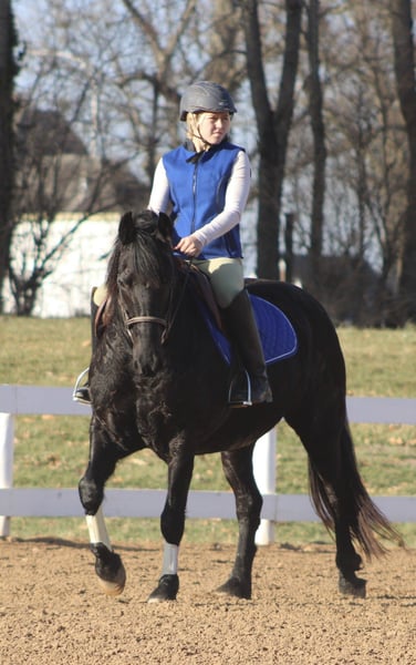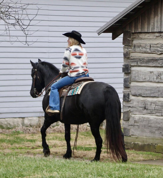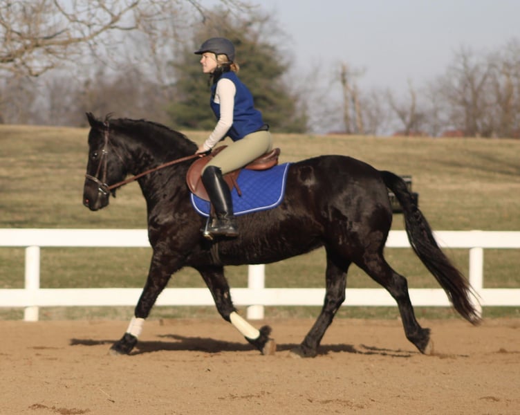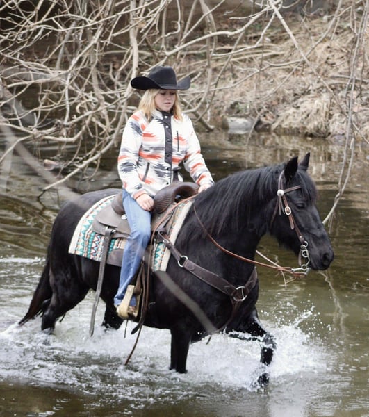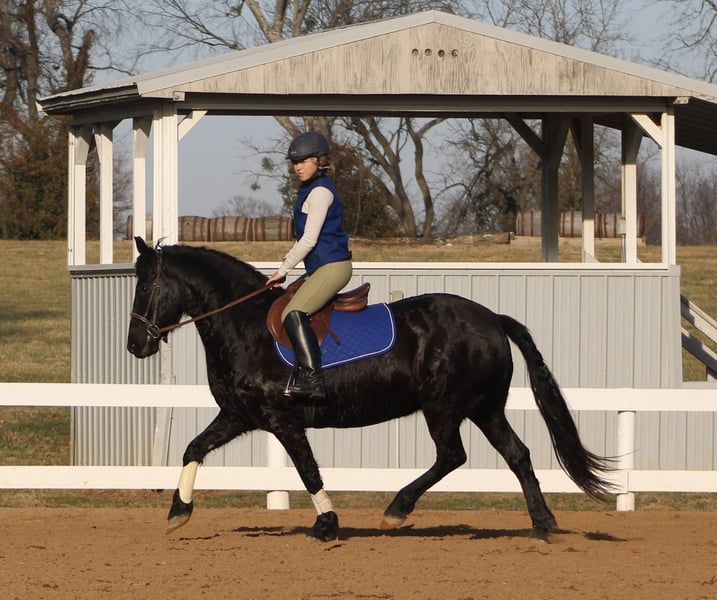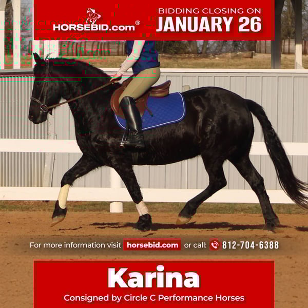 𝐉𝐀𝐍𝐔𝐀𝐑𝐘 ⭐️𝑨𝒍𝒍 𝑺𝒕𝒂𝒓 𝑳𝒊𝒏𝒆𝒖𝒑⭐️ Happening now thru MONDAY | JANUARY 26th - Available EXCLUSIVELY on HorseBid's website! For more details and to register visit: www.Horsebid.com CONSIGNOR CONTACT: Circle C Performance Horses 812-704-6388 LOCATION: Borden, IN BREED: Friesian Sport Horse REGISTERED: Yes REGISTERED NAME: Karina COLOR: Black HEIGHT: 14.2 AGE: 11 GENDER: Mare Karina 2015 Registered Friesian Sport Horse Mare | 14.2 Hands Karina is a striking black Friesian Sport Horse mare offering the elegance, movement, and presence of the Friesian breed in a more manageable and rider-friendly size. Standing 14.2 hands, she is big-bodied and well balanced, able to comfortably carry a variety of riders without ever looking out of proportion. Her size makes her an excellent option for those who admire the Friesian look but prefer a smaller, more approachable mount. She has been extensively ridden both English and Western and has competed in schooling and open shows. Karina is soft, responsive, and willing, with smooth, correct transitions and an adjustable way of going. She can slow jog quietly for Western riders and shows off a beautiful, expressive extended trot in English. While not formally trained over fences, she is confidently worked over ground poles and regularly hops logs and natural obstacles on the trail. This mare is far more than just an arena horse. Karina is a seasoned trail mount that has been ridden through pastures, on trails, and down the road through town. She confidently handles water crossings, rough terrain, and rides out alone without hesitation. She is experienced with overnight camping trips and stands quietly tied at the hitching rail. Karina is well mannered on the ground, easy to groom, stands quietly for tacking, and is respectful for the farrier. She loads and unloads easily in the trailer, stalls well when needed, and gets along nicely in a mixed herd setting. She can be kept barefoot or shod, depending on the new owner’s preference. She has no vices. Extremely versatile, uncomplicated, and enjoyable to ride, Karina is the type of mare that most riders will get along with immediately. She is suitable for a wide range of disciplines and riding styles, making her a wonderful choice for someone seeking an elegant, dependable, and well-rounded Friesian Sport Horse. For more information, please call 812-704-6388.