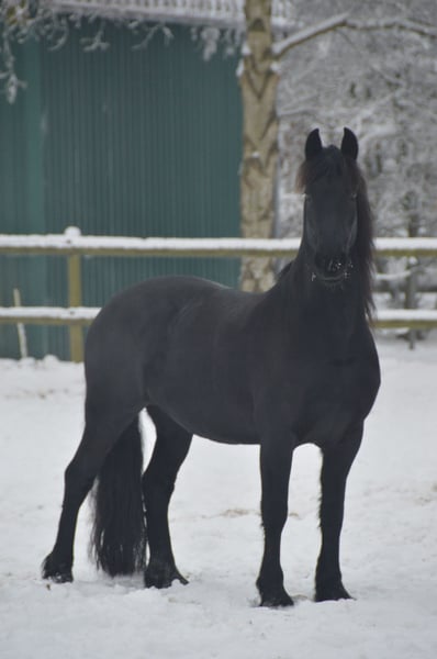 With a heavy heart, I am seeking a new, loving home for my wonderful Friesian mare, Thalia (born 2012). I purchased Thalia directly from the breeder as a two-year-old, and she has been in my possession ever since. She has been used in a variety of disciplines and activities. From circus tricks to competition participation (E-level eventing, rider competitions with her riding partner), as well as numerous festive parades with drums and cannons, ring riding, and rides alone, in groups, or with a sidewalker—nothing is impossible for Thalia. She always remains calm, keeps her nerves, and is easy to handle in any situation. In the herd, she is low-ranking and very social (avoiding conflicts). She loads and travels easily alone, and is always well-behaved at the blacksmith (barefoot). Thalia is simply extremely uncomplicated to handle and always gives her best for her person. Since she is suitable for breeding, she successfully and instinctively foaled a healthy, typy filly in 2019 (Friesian x Hanoverian). The foal is also in my possession and has already been placed in jumping up to A* level and in eventing (see the last three photos). This is not a distressed sale! I will only rehome Thalia if everything truly fits. Inquiries from dealers and riding schools will not be answered. Due to her breed, she is not suitable as a weight carrier. Additional photos and videos available upon request.