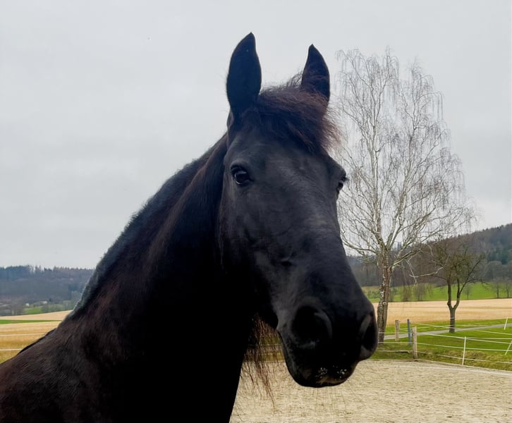 Zum Verkauf steht eine wunderschöne Friesenstute aus dem Jahr 2011. Sie ist eine elegante, typvolle Stute mit einem Stockmaß von 161 cm und deckt damit auch größere Reiter sehr gut ab. Die Stute eignet sich hervorragend für die Freizeit und den leichten Dressursport. Sie ist im Stutbuch I des FPZV eingetragen und hat die 2. Staatsprämie. Die charmante Stute besticht durch ihr einnehmendes Wesen, ist bestens erzogen, absolut brav und verschmust im Umgang und hat ein sanftes, ruhiges Temperament. Das macht sie zu einer idealen Partnerin für Ausritte und entspannte Stunden im Gelände – allein und in der Gruppe. Hier ist sie sehr leicht handelbar und gut als Familienpferd (vielleicht für Eltern & Kinder) geeignet. Bocken, Steigen oder unkontrolliertes Loslaufen sind ihr unbekannt - auch wenn sie längere Zeit nicht gearbeitet wird. Sie ist auf A-Niveau ausgebildet, wurde aber aus Zeitgründen von mir nur selten auf Turnieren vorgestellt. Unter einem einfühlsamen, erfahrenen Reiter, der sie mit freundlicher Konsequenz abwechslungsreich weiter fördert und fordert, zeigt sie hier gerne ihr Können. Auf Turnieren zeigt sie sich stets entspannt und konzentriert, fremde Umgebungen, Menschen und Musik stören sie nicht. Die Stute kennt Longieren, Bodenarbeit und schätzt Stangentraining bis hin zu kleinen Sprüngen. Sie ist 100% verkehrssicher, egal, ob Busse, Landmaschinen, Züge oder Menschansammlungen - sie bleibt ruhig. Sie wird regelmäßig gearbeitet (Dressur; Gelände; Stangen- und Bodenarbeit; Longe) und könnte sofort weitergearbeitet werden. Sie ist sehr gut sozialisiert und versteht sich sehr gut mit anderen Pferden. In der Herde ist sie eher zurückhaltend, aber immer sehr gut integriert und kennt sowohl 24/7-Weidehaltung als auch die Kombination aus Weide- und Boxenhaltung. Wenn Sie auf der Suche nach Ihrem Herzenspferd, einem treuen Begleiterin für gemeinsame Freizeitaktivitäten oder einem neuen Familienmitglied sind - dann ist diese wunderschöne Friesenstute genau das Richtige für Sie! Ihr Verkauf ist kein Notverkauf, sondern geschieht nach reiflicher Überlegung aufgrund einer neuen persönlichen Lebenssituation. Aus diesem Grund entscheidet hier Platz vor Preis. Achtung: Die Stute ist kein Gewichtsträger! Bei Interesse oder für weitere Informationen melden Sie sich gerne. Ich freue mich auf Ihre Nachricht!
