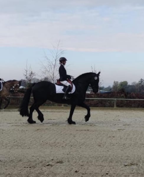 Offro in vendita una meravigliosa cavalla Frisona di 15 anni. Non è una vendita urgente! Non sarà venduta a cavalieri di concorso puri. Ho acquistato Dali completamente indomata, a 3 anni, e da quasi 13 anni è in mio possesso. È stata sempre nella stessa casa e non ha subito cambi di proprietario o altri traumi. Dali ama e ha bisogno di varietà. Proviene dai Paesi Bassi e possiede documenti KFPS con un'ottima genealogia. Da puledra ha ricevuto il 3° premio ed è una discendente di Olrik 383. - È addestrata fino al livello L e ha ottenuto piazzamenti fino all'A** secondo il LPO. - È addestrata secondo la dressage classica, non secondo il tipico metodo di equitazione inglese FN. - Ha partecipato due volte al Friesencup, dove si è piazzata tra le 10 migliori Frisoni in classe E e classe A su oltre 100 partecipanti. - Ha partecipato a piccoli concorsi di salto, così come a giochi come Jump & Dog. - Lavoro con lunghe redini, lavoro a mano, lungaggini. - Lezioni di circo, tra cui il passo spagnolo. - Rally di equitazione. - Passeggiate. - È facile da montare per bambini, principianti e non cavalieri. - Partecipazione al conseguimento di brevetti di equitazione. - Ha fatto un po' di volteggio. - È montabile senza sella fino alle lezioni di livello L. - Molto adatta per la working equitation. - Senza ferri, tranne in occasione di concorsi regolari o attività all'esterno, allora ha 4 ferri. Cerco qualcuno per Dali che voglia semplicemente divertirsi con il cavallo. Che sia giovane o anziano, principiante o cavaliere esperto, non importa. Il cavallo e il divertimento devono essere al centro dell'attenzione. Si può e si deve fare di tutto con lei. Che siano piccoli salti, dressage, semplici passeggiate o divertirsi semplicemente con il cavallo, lasciandola correre libera e giocando a "prenderla". Risponde molto bene alla voce e ai comandi. Si gira in galoppo su se stessa e si diverte quando può correre di nuovo verso di te per ricevere un pezzo di carota. Deve essere vista come una migliore amica, con cui si possono affrontare le difficoltà e creare molti momenti belli. Per motivi di tempo, Dali è attualmente fuori dal vero allenamento da circa 3 anni. Tuttavia, viene ancora montata e tenuta occupata.