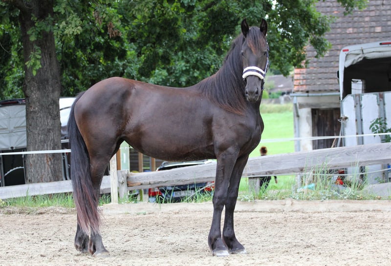 Cette jeune et élégante jument frisonne séduit par son apparence impressionnante et son allure majestueuse. Elle se déplace très facilement, avec beaucoup de franchissement et d'élan. Que ce soit en concours ou sur le carré de dressage, elle attirera certainement tous les regards. Elle est née le 14.5.2023 et descend de Sipke 450 (Teade x Ulke) de la jument Aria (Jurre o. x Doaitsen). Elle est pucée et enregistrée au "Veulenboek". Winni est très éveillée, attentive, mais aussi proche de l'homme et câline. Elle maîtrise tout ce qu'un cheval de son âge doit savoir - elle donne les sabots sans problème, se laisse guider et panser. Dans le troupeau, elle est également très simple. Elle est bien entendu vaccinée, vermifugée et présentée régulièrement au maréchal-ferrant. Elle peut volontiers rester pour l'élevage (conditions très favorables, plusieurs copains du même âge). Elle est en bonne santé, le test d'élevage peut être fait à tout moment. Plusieurs chevaux intéressants dans les autres annonces. Si vous cherchez quelque chose de différent, n'hésitez pas à nous contacter. Vous avez besoin de vous convaincre de notre travail ? Venez visiter notre page Facebook, où vous trouverez également des évaluations de nos clients étrangers.