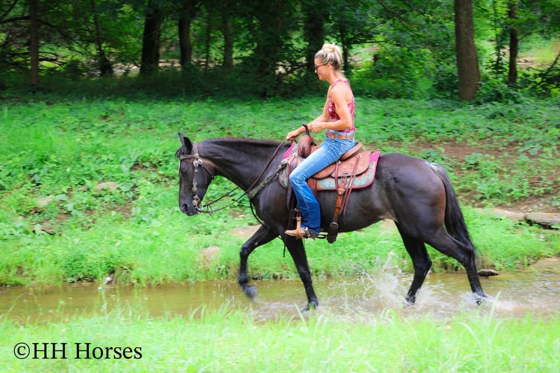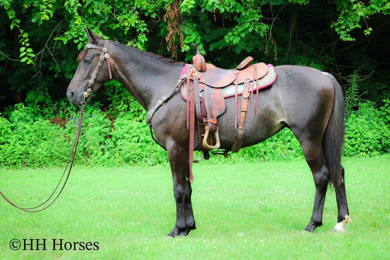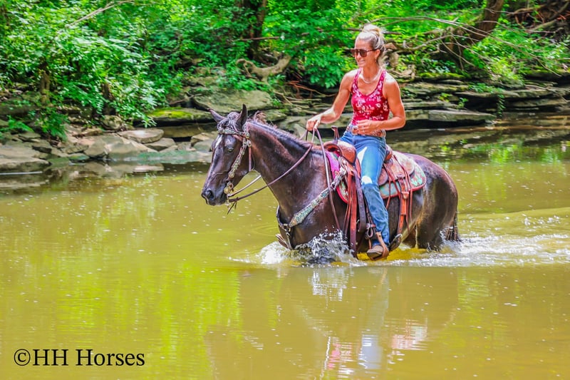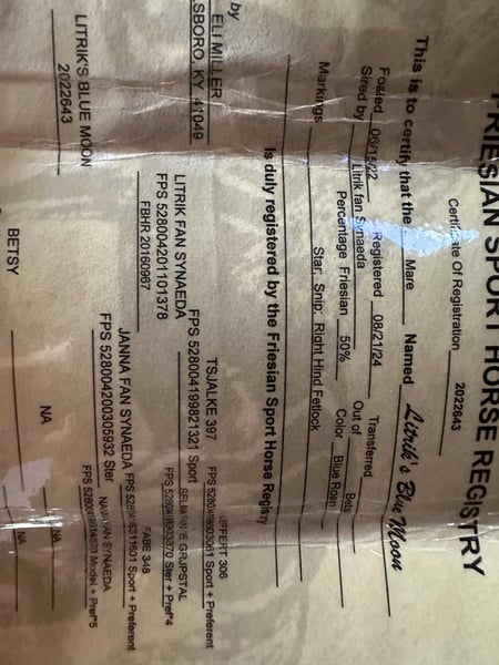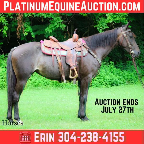 ONLINE AUCTION Place your bids at www.PlatinumEquineAuction.com Starting Bid $3500 Auction ends July 27th 2025 Need a new saddle? Check out White Rock Saddles on our website or Facebook This is “LITRICK’S BLUE MOON”, a gentle REGISTERED BLUE ROAN FRIESIAN SPORT HORSE MARE that is broke to ride and drive. She is a Friesian Morgan cross. This mare is 3 years old and stands 15 hands tall. She is well started and riding and driving very nicely. She is confident, civilized, cool, and calm. This mare has been through the woods, in the deep water, and up and down the mountainous terrain. She has been hauled to state parks for trail riding and will picket line overnight quietly. She stands tied to a trailer, loads, bathes, and hauls with no fuss. She is solid, has an excellent mind, and is not spooky. She is young yet will behave better than most horses twice her age. She walks out nicely relaxed on a loose rein, will lope circles, and stands to harness, hitch, tack, mount, and groom. She has the best temperament, has been ridden and handled by novice riders, and hitched and driven by beginners. She wants to be good, she aims to please, and has been handled daily since birth. Located in Flemingsburg, KY. Contact HH Horses Erin 304-238-4155 with any questions, to make a Buy It Now Offer or to schedule a time to come see her. ONLINE AUCTION Place your bids at www.PlatinumEquineAuction.com Starting Bid $3500 Auction ends July 27th 2025 Need a new saddle? Check out White Rock Saddles on our website or Facebook