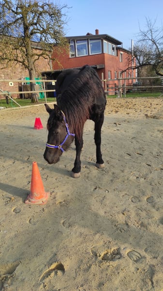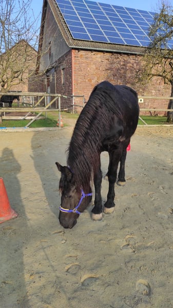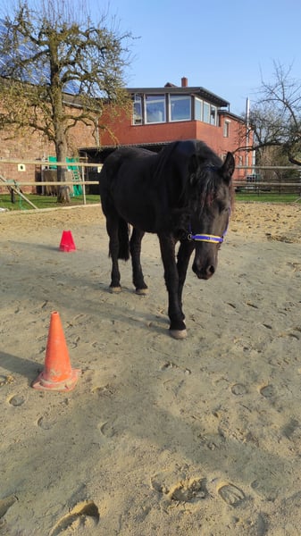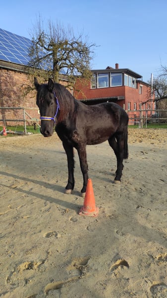 Zum Verkauf steht unsere ausdrucksstarke, noch nicht ganz 4 Jahre junge, Friesenstute "Thalia". "Thalia" ist eine langbeinige Schönheit, die ihrer vollen Entfaltung noch entgegensieht. Sie wurde von uns, nach Übernahme von Züchter, seit nunmehr ca. 3 Jahren liebevoll in einer kleinen Herde großgezogen. So fand "Thalia" bei uns, was sie für ihre Entwicklung nach Abgabe durch den Züchter brauchte: Einen Familienverband bestehend aus einem Sicherheit vermittelnden Herdenchef, einer ruhigen & gelassenen Friesenstute sowie deren Sohn, der "Thalia" ein wohleigener, großer Bruder ist. "Thalia" lebt mit Box & Paddockhaltung, hat ganzjährig Auslauf, frische Luft & Tageslicht. Die Fütterung erfolgt 24/7 nach festen Zeiten. "Thalia" lernte bei uns nicht nur das sog. Fohlen-ABC, sie kennt auch diverse Ausrüstungsgegenstände sowie Bodenarbeit. Auch an der Longe zeigt die sich brav & motiviert. "Thalia" ist barhuf, wird regelmäßig von einer zertifizierten Huforthopädin bearbeitet, was sie ohne Probleme ordentlich erledigt. Regelmäßig wurde sie sowohl den TA, als auch dem ZA vorgestellt. "Thalia" ist gechipt, geimpft & wird regelmäßig entwurmt. Sie hat keine Ekzeme, keine Mauke, keine Raspe oder ähnlich andere Erkrankungen. Einzig Getreide verträgt sie "noch" nicht gut, weshalb wir bei "Thalia" auf getreidearme/-freie Zusatznahrung achten. "Thalia" ist ein roher Diamant, die ihre volle Schönheit, Pracht & Leistungsvielfalt erst noch entfallen wird. Ihre Anlagen sind jedoch heute schon sehr gut zu erkennen. Wir suchen für "Thalia" ein passendes Zuhause, ohne zeitlichen Druck. Bevorzugt wird "Thalia" in friesenerfahrenen Hände abgegeben, die ebenfalls die notwendige fachliche Kompetenz zur weiteren Förderung & Ausbildung mitbringen. Haben wir Ihr Interesse geweckt? Dann kontaktieren Sie uns gerne für weitere Fragen und/oder einen Besichtigungstermin. Es handelt sich um einen Privatverkauf. Es gelten insofern die üblichen Bestimmungen zur Sachmängel-Haftung, Gewährleistung & Garantie (= Ausschluss).