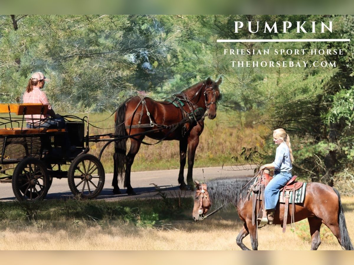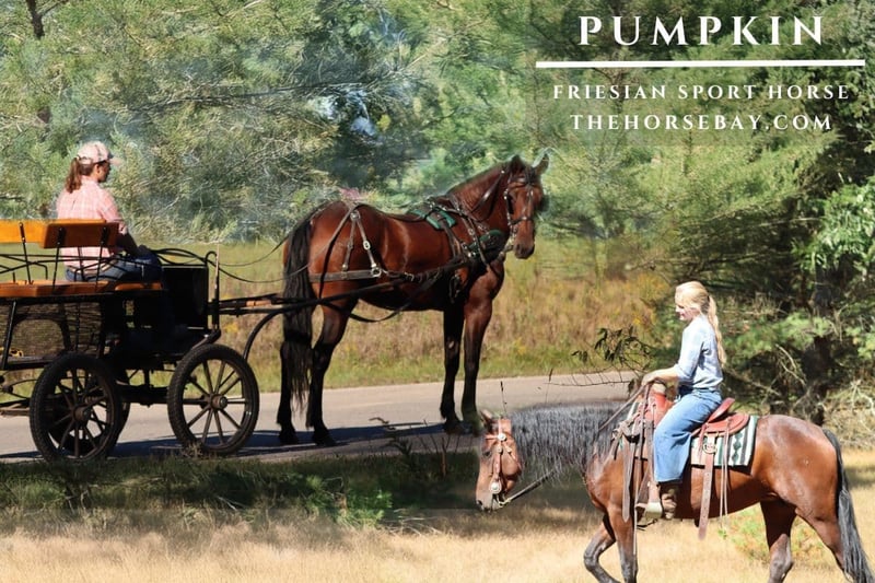 Pumpkin is a 5yr old Friesian Morgan cross mare standing at 15 hands tall. She has that nice stout build with the solid legs and feet of the Friesian so she can easily carry a bigger rider. And we bought Pumpkin from the breeders, so we have her full story there are NO unknowns with her. Pumpkin both rides and drives. For riding she is great she will tackle the steep hills and banks no problems. She will cross big logs, bridges both big and small, and crosses creeks/rivers. She has smooth gaits. She takes her cues right away when asked. She knows how to move off of your legs and has a willing to please attitude. She is very friendly and easy to catch she catches herself. She has that nice Morgan personality that wants to be with people. She gets along great out in the herd she’s middle of the pecking order. She’s an easy keeper. She stands so good for the farrier that she gets the hot shoe treatment. She stands good for mounting and tacking. Loads right in the trailer and backs right out. And she doesn’t mind having a doggy friend along out in the woods. Tramp loves to come running full speed up behind her and popping in and out of the brush and she doesn’t mind it at all. She is a fun enjoyable ride and the thing I love most about her is how smart she is she really takes after the Morgan side in the way she acts and thinks. The icing on the cake is the Friesian side with that nice stocky build and the thick wavy mane and tail. And I love a good looking blood bay she just has it all good confirmation and genetics. For driving she stands good to hitch and unhitch. Stands good at the stop signs and for getting on/off the cart. She is fine with light traffic, but if it is something big, noisy, or really scary she will look at it or step to the side that is all she does she has NEVER did anything worse than that. She has always been driven down quieter dirt country roads, so she really hasn’t seen a lot of different traffic. And she has absolutely NO bad habits or vices and NO maintenance required. I would consider her a husband safe type of horse. She comes up to date on everything farrier, vet check, coggins, shots, and dewormings. Just give a call if you have any more questions or want to come see her. She is truly a very nice willing mare with a very friendly personality and if you love to do trails you will really love Pumpkin, she is a trail queen!