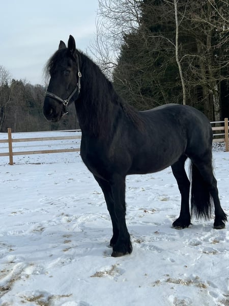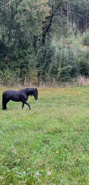 For sale is this 6-year-old Friesian mare with full papers, born on May 10, 2019. Lenya, affectionately called Leni by us, is a very friendly and lovable mare. Whether approaching her in the pasture or in the stable, she always greets you warmly. Once she has truly built trust, she will go anywhere with you. She is always motivated in work and eager to please. She especially enjoys and is highly motivated during groundwork and free work. She has begun to learn the Spanish walk and shows preliminary movements for the Piaffe. Additionally, she can be guided to park herself as an aid for mounting and responds well to the command "turn around." Leni’s subtle body language allows for lightness and joy in her work, making interactions with her very pleasant. Leni was trained at Naturalhorsing in Neuhaus. However, she has not been ridden for the past six months. Thanks to her open and honest nature, we can also envision her as a breeding mare. We would love for Leni to find a home where she can continue to be kept within a herd. It would be wonderful if someone were looking for a warm-hearted, lifelong leisure partner.
