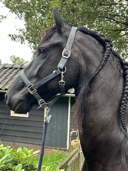 Beautiful luxurious mare with a colt foal by Tijmen. Slimly built, with a full tail and mane. Jet-black coat, noble head. She has had four foals and foals easily without assistance. Inbreeding coefficient 1.37, relatedness 18.8, mare line 049. She is leaving with a heavy heart due to the end of her breeding career. She is trained but has been standing idle for some time due to a foal at her side.