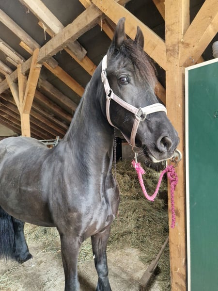 Elegante Friesen-Stute, geb. 2017, sucht neuen Besitzer Diese wunderschöne Rappstute ist eine echte Augenweide und überzeugt durch ihre beeindruckende Erscheinung sowie ihr freundliches Wesen. Mit einem Stockmaß von ca. 160 cm bietet sie die perfekte Größe für vielseitigen Einsatz und ist sowohl für Freizeitaktivitäten als auch für den täglichen Umgang bestens geeignet. Die Friese ist eine äußerst charakterstarke Rasse, bekannt für ihre elegante Erscheinung und ihr angenehmes Temperament. Sie ist sehr anhänglich manchmal aber etwas unsicher und benötigt deswegen eine sichere Person. Sie ist gesund, regelmäßig entwurmt und geimpft, und befindet sich in einem gepflegten Zustand. Die Stute ist vielseitig einsetzbar, ideal für ausgedehnte Ausritte, Spaziergänge im Gelände oder auch für die tägliche Freizeitgestaltung. Sie geht ohne probleme alleine ins Gelände. Wenn Sie auf der Suche nach einer zuverlässigen, charmanten Freizeitpartnerin sind, die mit ihrer Ausstrahlung und ihrem angenehmen Wesen begeistert, dann ist diese Friesen-Stute genau die richtige Wahl. Für weitere Informationen und einen persönlichen Eindruck stehe ich Ihnen gerne zur Verfügung.