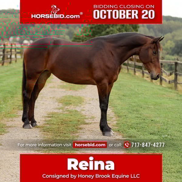 ♦️ 𝐭𝐡𝐞 𝐀𝐌𝐄𝐑𝐈𝐂𝐀𝐍 𝓕𝓪𝓵𝓵 𝓒𝓵𝓪𝓼𝓼𝓲𝓬 ♦️ Happening now thru MONDAY | OCTOBER 20th - Available EXCLUSIVELY on HorseBid's website! For more details and to register visit: www.Horsebid.com CONSIGNOR CONTACT: Honey Brook Equine LLC 717-847-4277 LOCATION: Honey Brook, PA BREED: Friesian/Warmblood REGISTERED: Yes REGISTERED NAME: Reina COLOR: Bay HEIGHT: 16 AGE: 8 GENDER: Mare Reina is an 8yo registered Friesian Sport Horse mare. She has a strong dressage foundation and is schooling for first/second level dressage with good lateral work including the shoulder in . Reina has schooled up to 3 ft courses with room for more,she is very honest and steady to her fences and enjoys the jumps! Reina has also schooled cross country novice height; where she is also very honest and steady in her fences. This pretty girl also has training in western dressage,along with being trained on obstacles for Working Equitation ,she is a quiet girl and has poined other horses off of her,she works with flags, tarps, and pulls objects behind her while under saddle,she is accustomed to dogs while riding and has lived alongside goats and chickens. Reina enjoys trail rides,crosses water and has always been barefoot.. Reina is easy on and off for trailering ,so hauling her to shows or special outings can easily be done by one person, She has hauled long distance as well as local Reina is an easy keeper, can live in or out, she is excellent for farrier and vet,She is a curious girl,as sweet as they come and loves to be groomed,bathed, pampered and clipped,She loves carrots,apples, and peppermints ,,be sure to watch the video!! PPE welcome at buyers expense, can help arrange shipping anywhere in the US! Reach out to us for more information!