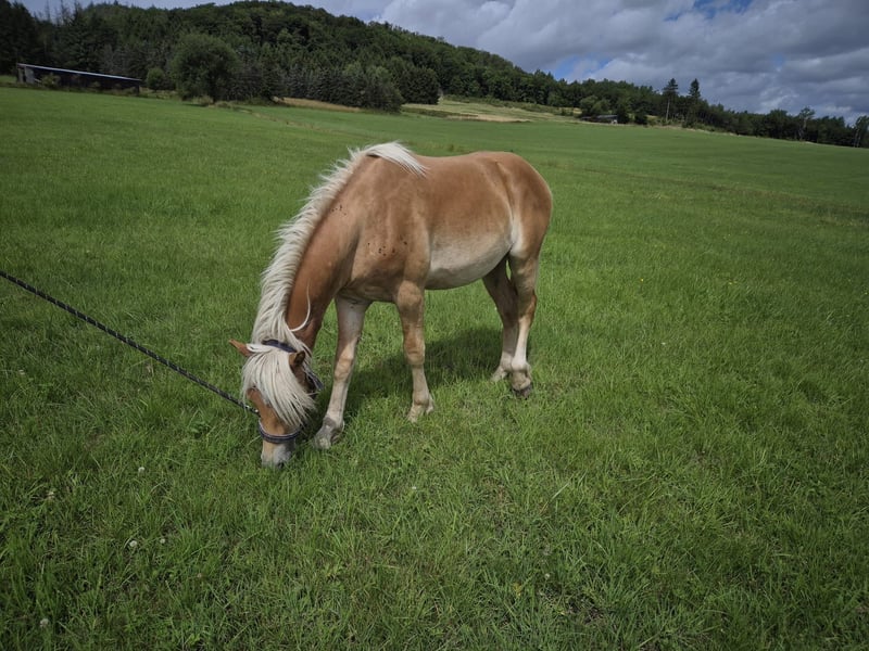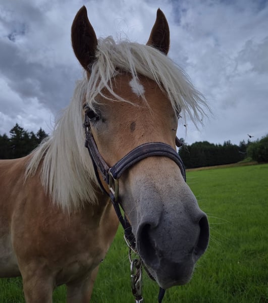 Pepino – our little charmer and cuddle king has been with us since October, will turn one year old in March, and has learned a lot since he moved from the mountain pasture. He walks nicely on the halter and has integrated well into the herd. Not as bold as his buddy Sofus, he likes to hide behind him when situations get too scary. He has also learned to watch the older horses and see how they behave. That's why he now greets the tractor with joy when it brings fresh hay and already knows all the vehicles that deliver his food. He stands calmly for the vet, takes deworming treatments without a halter, and offers his front hooves without being held, but he is not too keen on having his hind legs touched, so a bit of patience is needed to convince him. But we are sure he will manage that soon without any issues. The farrier still finds him very well-behaved. He is already familiar with dogs, chickens, and ducks, as well as everything else that roams in the forest. Has Pepino piqued your interest? Then get in touch, and the charmer can soon wrap you around his little finger too.