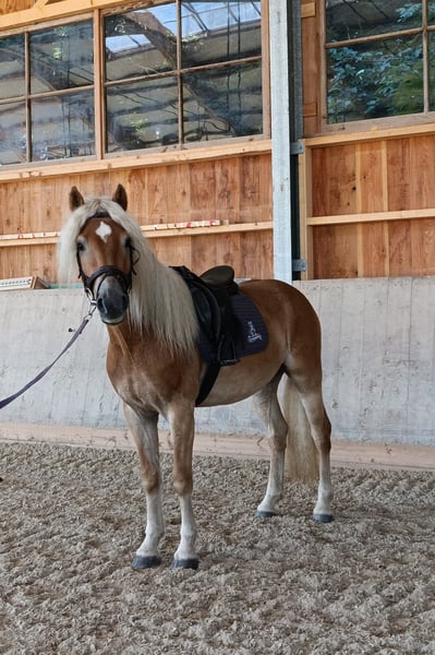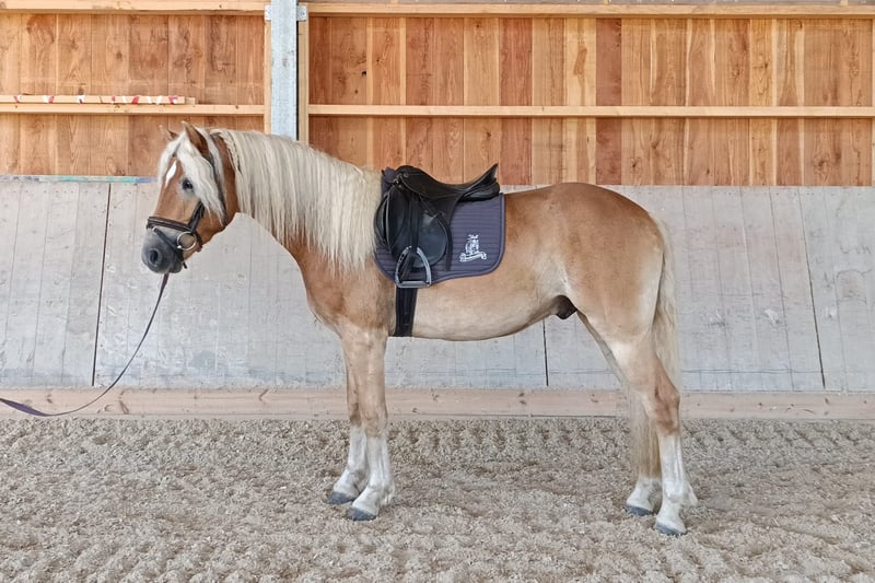Stiegl, a stunning, large three-and-a-half-year-old Haflinger gelding for sale. Stiegl has been raised in a herd environment and spent his summers on a stallion pasture. He enjoys affection and attention. At the free-running and free-jumping championship, he impressed with his willingness to perform and his sociable nature. He already stands at 154 cm (15.1 hh). He is started under saddle and shows himself to be a great partner with a lot of joy in his work. For inquiries, please contact Josef Fink at +43 664 4293570.