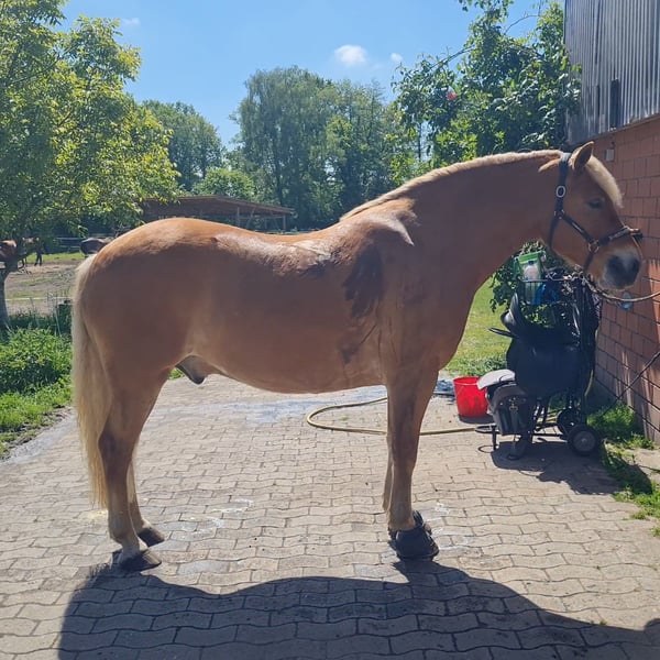 Wonderful Haflinger gelding (purebred, directly from South Tyrol) is looking for the best home in the world – one that offers full attention, enough time, and passion. - He was born on May 3, 2016, - stands at 1.56 m (approximately 15.2 hh) and accommodates taller riders well, - loves groundwork and free work, - eagerly masters pole work and desensitization training, - is familiar with working in double lunge and long reins, as well as ground driving, - is trained in CLASSICAL dressage with a focus on gymnastic development (horse-friendly, without excessive driving or harsh hands!), - can also be ridden bitless, using a neck ring and pad, - responds relatively sensitively to voice and weight aids, - is lunged in correct position and bend with a cavesson, - goes out alone into the countryside, provided you give him the necessary confidence, - is equally enthusiastic about equikinetic exercises, dual activation, and trail tasks. In short: A well-mannered, totally reliable, and uncomplicated leisure companion who loves to be engaged and entertained! He is simply a fantastic all-rounder who participates bravely and curiously in everything. Not a typical "bully" like you might find in poor riding schools! However, you should know what you are doing and act with the necessary fair consistency, or if you are a beginner or returning rider, at least be accompanied by good riding instruction to grow together. Of course, he is regularly vaccinated (influenza + tetanus), dewormed, treated by the dentist (annually), and sees an osteopath and physiotherapist at least twice a year (also as a precaution). His hooves are trimmed every 5-6 weeks, and his saddle and other equipment are checked annually by a saddler. X-rays of his hooves and spine are available – all clear! Nutritional advice for optimal mineral intake based on hay analysis and blood work is taken annually and adjusted accordingly. I wish for someone who can dedicate the necessary time and attention to him. I personally strive to keep him entertained daily (though riding shouldn't be the only focus), but I can no longer manage this long-term and simply cannot find suitable riding partners for support! I would only consider parting with him if I feel I have found a truly wonderful person and the right home. He needs plenty of turnout and absolutely requires social contact in a herd (he can also easily stand with mares in a mixed group), as he is very sociable! This should go without saying! Due to his breed, he tends to gain weight, so portion-controlled roughage feeding is ideal (no haylage!). With me, he has free access to the hay feeder during the day (with additional pasture in summer) and at night, he gets his hay net in his "apartment." This has helped him maintain his weight for over a year. If you have any questions or are interested, please feel free to reach out. He can, of course, be visited and met. A trial ride is also possible, as he is still being worked with. He was gently prepared for everything at the age of five and is therefore not "overcooked." Due to his gentle nature, he is not suitable for competition participation! Off-site clinics, courses, and outings pose no problem. He would certainly enjoy disciplines such as Western Pleasure, Trail, or Working Equitation.