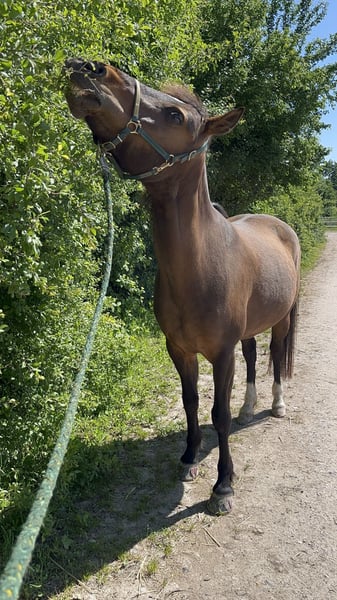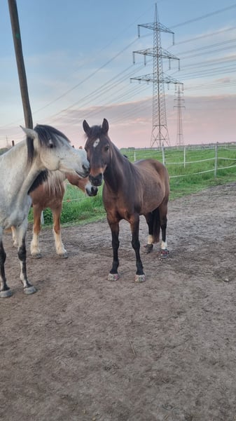 Hallo zusammen, Chayra ist eine 11 Jährige Haflinger-Araber mix Stute, stockmaß 1,45m. Ich habe sie im März diesen Jahres gekauft, seid dem stand sie im Offenstall mit 24/7 Heu. Leider hat sich gezeigt das sie KEIN Sättigungsgefühl hat und dementsprechend kein limit für ihren heu Konsum hat. Sie hat 40 kg zugenommen was wider rum eine Huflederhautentzündung hervorgerufen hat. Die Entzündung ist vollständig ausgeheilt und eine Rehe wurde durch Röntgenbilder ausgeschlossen. Zurzeit trägt die genagelte Duplos vorne barhuf hinten, dass klappt auch sehr gut. Trotz allem Glück ist klar, Chayra braucht einen Platz wo sie regulierten Heuzugang hat. Sie ist sozial in der Herde verträglich und ranghoch. Im Umgang zum menschen ist sie unglaublich treu und gutmütig. Sie ist sehr aufmerksam und denkt in der Arbeit selbst mit. Sie wurde bei ihrer Vorbesitzerin Western ausgebildet, ich habe hauptsächlich Bodenarbeit nach Parelli mit ihr gearbeitet und sie am knotenhalfter ohne Sattel im Gelände geritten. Sie hat eine menge Energie die sie gerne rauslässt, ist aber immer ansprechbar und hört auf jedes stopp. Sie ist mutig und selbstsicher und erschreckt sich seltenst. Ich würde mir eine Person wünschen die: • nicht über 70 kg wiegt • zeit für genügend und viel Bewegung hat • einen Stall mit reguliertem heu bieten kann Gerne können wir ein Telefonat vereinbaren und gegebenenfalls ein kennenlernen. Fragen sind wilkommen. Herzliche Grüße Kaufmann Julia