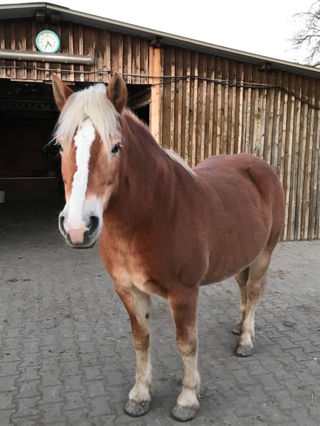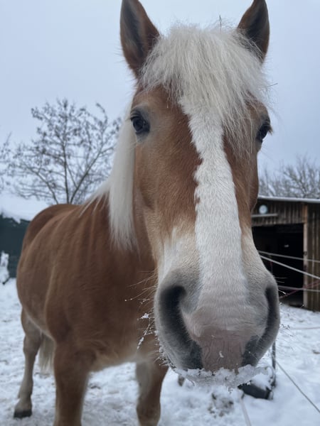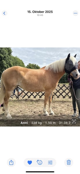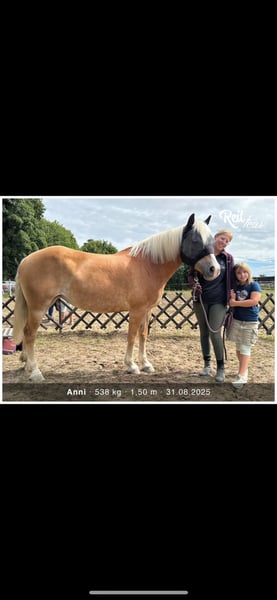 Stute Anni sucht ein neues Zuhause 14 Jahre alt 152 groß laut Pass : ,,Mix“ Wir haben sie seit einem Jahr, ursprünglich für unsere Kinder als Anfänger Pferd gekauft. Leider haben wir gemerkt das Anni nicht für Anfänger geeignet ist und kommt bei uns viel zu kurz. Sie braucht einen Menschen der sich um sie kümmert, mit Ruhe und Konsequenz arbeitet und mit ihr noch viel erleben möchte. Zu ihrer Vorgeschichte können wir nichts sagen, nur das sie auch als Kutschpferd gelaufen ist. Bei uns hat sie ganz viel gelernt. Alles wie longieren, Handarbeit und Horsemanship. Sie geht alleine oder in Begleitung spazieren. Auch als Handpferd läuft sie mit. Im Sommer waren wir viel ausreiten da war sie sehr brav. Richtung Herbst wurde sie dort aber unsicherer/ängstlicher. Könnte evtl. auch daran liegen das wir sie nicht mehr genug auslasten konnten. Auf dem Platz mag sie nicht gerne geritten werden. Da sie die Nähe zu anderen Pferden sucht wäre eine größere Herde für sie perfekt. In unserer 3er Gruppe steht sie im Offenstall und ist ranghoch. Sie kam voll beschlagen zu uns, läuft jetzt barhuf und draußen mit Hufschuhen. Wir haben sie sehr ins Herz geschlossen und suchen für sie jemanden der ihr einen Endplatz bieten kann. Sie wurde bei uns regelmäßig entwurmt , osteopathisch behandelt,die Zähne von einem Dentist bearbeitet und die Hufe wurden engmaschig bearbeitet. Eine kleine AKU der Vorbesitzer liegt vor sowie die Zahnbehandlungs Protokolle. Ein passender Sommer Destination kann gegen Aufpreis mit erworben werden. Seit Ende 2025 aufgrund der Wetterverhältnisse und da wir nur einen kleinen Platz zum longieren haben wurde sie hauptsächlich vom Boden gearbeitet. Für uns gilt Platz vor Preis dieser ist absolut VHB. Bitte nur bei ernsthaften Interesse melden , vorab gerne Fragen per Nachricht senden wenn wir merken es könnte passen können wir gerne weiteres per Telefon besprechen.