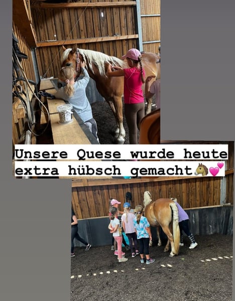 Unsere quirlige Haflinger Stute Quese, Stockmaß 1,46m geboren 2010, sucht ein liebevolles Zuhause. Aufgrund ihres Sehnenschadens ist ein Einsatz im Schulbetrieb für sie leider nicht mehr möglich. Gemütliche Spaziergänge, evtl. Schrittausritte und Bodenarbeit bereiten ihr viel Freude. Deshalb suchen wir für sie einen Platz als Beisteller an dem sie aber auch noch etwas Aufmerksamkeit und Zuwendung bekommt. Quese wird wie alle unsere Schulpferde regelmäßig geimpft, entwurmt und dem Tierarzt zur Zahnkontrolle sowie dem Hufschmied vorgestellt. Sie ist sehr herdenverträglich und eher rangniedrig. Platz vor Preis! Gerne auch mehr per Tel. 0170-262 49 31