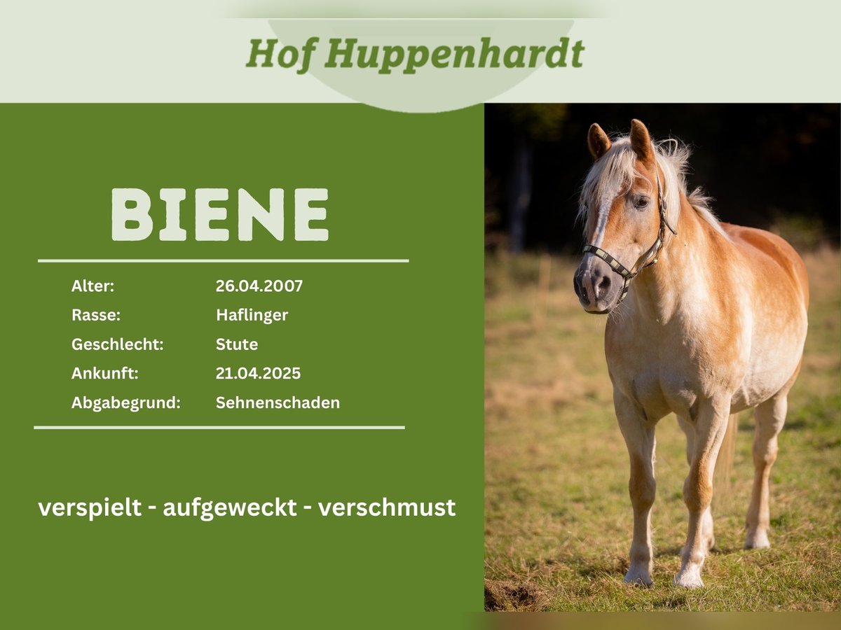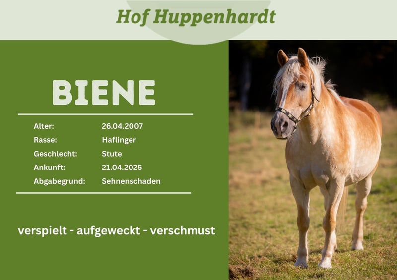 Wir suchen ein neues Zuhause für unsere Haflingerstute Biene. Die am 26.04.2007 geborene Stute wurde von uns im Frühjahr 2025 aufgenommen, da das ehemalige Schulpony eine Verletzung erlitt. Bei uns zeigt sie sich aufgeschlossen, neugierig und kontaktfreudig. Sie steht bei aktuell in Boxenhaltung und genießt die Weidezeit mit einer großen gemischten Gruppe. Sie ist eher im mittleren Rang, hält sich überwiegend aus Konflikten raus. Laut Vorbesitzer lief Biene im Reitschulbetrieb, galt dort als anspruchvolles Pony für Kinder die bereits besser reiten können. Wir haben bis jetzt nur gemütliche Schritt-Ausritte getestet, dies meistert sie mit Bravour! Ahira ist Menschen gegenüber aufgeschlossen, lässt sich überall berühren und fasst schnell Vertrauen. Manchmal ist sie etwas schreckhaft, lässt sich aber gut beruhigen. Am rechten Vorderbein erlitt sie laut Vorbesitzer einen Sehnenschaden. Nach einer gewissen Heilungszeit konnten wir allerdings in der Sehne keinerlei verletzte Strukturen mehr nachweisen. Gemütliche Bewegung tut ihr gut und diese genießt sie auch. Wir wünschen uns für sie ein neues Zuhause mit eigenen Menschen, wo sie das Pferdeleben richtig kennenlernen kann. Wir sind ein Tierheim für Großtiere. Alle unsere Schützlinge werden nach positiver Vorkontrolle und gegen eine Schutzgebühr vermittelt. Gerne können die Tiere nach vorheriger Terminabsprache bei uns auf dem Hof besucht und kennengelernt werden.