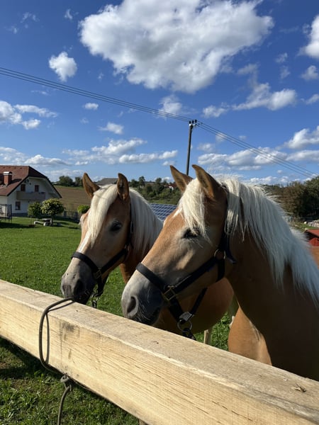 Both were born and raised within our family. They are healthy and without any restrictions. They have a calm temperament and are very people-oriented. They live together with other horses in a herd and are well socialized. Finny was born on April 14, 2024, and Bonny on February 20, 2024. We are located 40 km from Ljubljana, and you are very welcome to visit us at any time to meet Bonny and Finny in person. They can also be sold separately. €2,900
