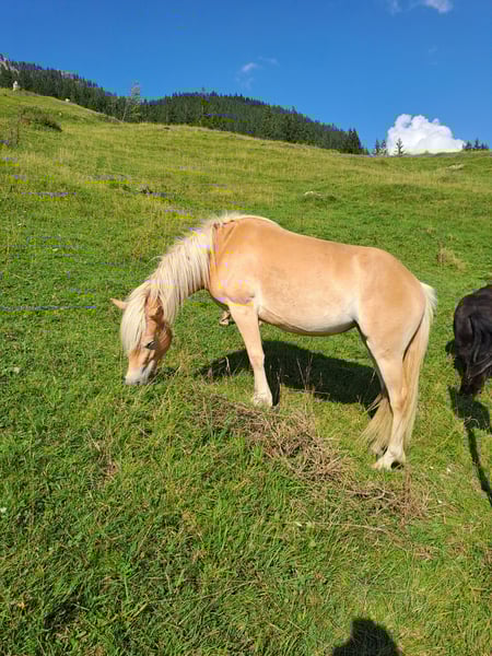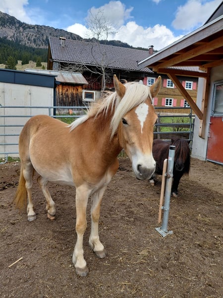 Abzugeben ist eine bildhübsche Haflinger-Stute, geb. im April 2023, Lichtrotlehmfuchs, mit einem derzeitigen Stockmaß von ca. 137 cm. Die junge Haflinger-Dame besticht durch ihr freundliches, neugieriges und sehr Menschen bezogenes Wesen. Sie ist gut sozialisiert, artig im Umgang und zeigt viel Potenzial für die weitere Ausbildung. Derzeit gehen wir spazieren und machen Führübungen und Sie ist als Handpferd beim reiten mit dabei. Sie hat beim ausreiten auch schon eine Satteldecke mit Gurt drauf, was Sie problemlos macht bzw. akzeptiert. Sie ist an Kinder gewöhnt. Maloija steht in einer kleinen gemischten Herde in einem Offenstall und zeigt sich sehr verträglich im Umgang mit Stuten und Wallachen. Sie ist barhuf (Hufe werden alle 6 Wochen gemacht), geimpft und gesund. Den Sommer verbrachte Sie auf einer Almweide. Auch diesen Sommer könnte Sie hier bei uns nochmals einige Monate auf der Almweide verbringen (bis ca. mitte September). Gesucht wird ein toller Platz, bei dem Sie jetzt dem Alter entsprechend gefördert wird. Kein Notverkauf, deshalb wird Sie nur abgegeben, wenn sich ein nachweislicher Bestplatz für Sie findet!!
