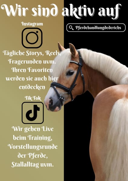 Camira is a beautiful Haflinger mare with full pedigree, descending from Stracato, Amadeus x Weltherr, Aras. She measures approximately 146 cm (14.1 hh) as of February 2026. *Camira* is a stunning mare with three very good gaits. She looks like a picture-perfect riding pony straight out of a book. She also has an excellent temperament—confident and completely honest. She already moves nicely in the arena, and with further training, she is sure to bring home many ribbons. She shows talent and enthusiasm over fences. She is already comfortable going out alone or in groups, and she handles unfamiliar environments calmly. Relaxation training and riding without a saddle are no problem for her. She is neither lazy nor too lively and enjoys working. We can also easily imagine her being suitable for less experienced riders, children, or teenagers, especially with a handler. She is very affectionate and equally easy to handle. Horse Trading Dederichs – Your Partner for Horse Buying Contact & Availability: Please inquire exclusively by phone at 0173/9792139 Monday – Friday: 9:00 a.m. – 6:00 p.m. Saturday: 9:00 a.m. – 3:00 p.m. Sunday: Closed Follow us on social media! Experience our daily work with the sale horses on Instagram, TikTok & Facebook at Pferdehandlung Dederichs Discount: Receive 5% – 10% off if you take your new dream horse immediately. Trial Riding & Demonstration: • Trial ride: €40 per horse (up to 2 riders), amount will be credited upon purchase • Holidays: Trial ride €50 • Demonstration by our trainers: €30 per horse (including lunging, ground work, etc.) Pre-Purchase Examination & Transport: • Many of our horses already have an pre-purchase exam (AKU) • You are welcome to bring your own veterinarian • We can also organize an examination for you • We are happy to assist with transport to your new home Other Horses for Sale: We have additional horses for sale in our stable that are not yet listed online. If your dream horse is not yet among them, please do not hesitate to contact us. Important Notes: • Height measurements are approximate and not precisely taken • All descriptions are subjective assessments by the seller and do not constitute guaranteed properties