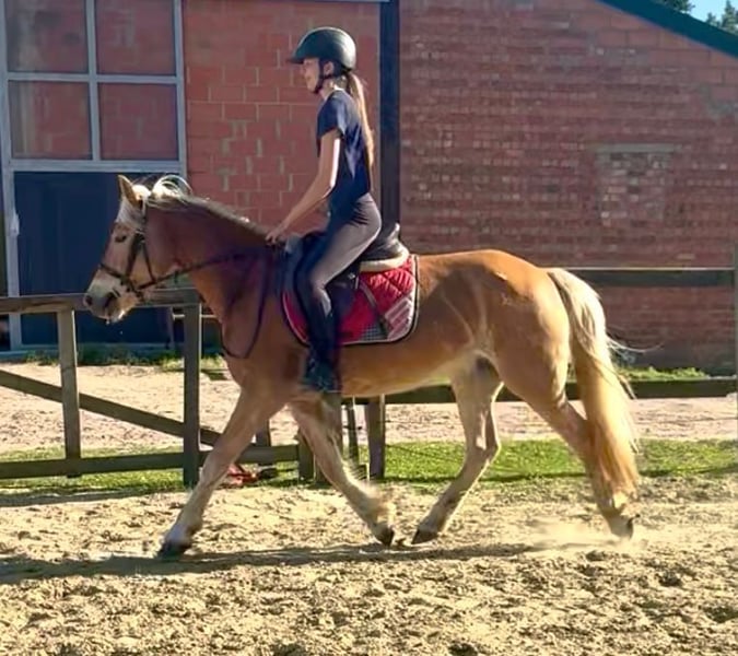 Super lieve & brave haflingermerrie Deze toffe dame is 5j en meet ong 147 +~ Ze is een echte allrounder; Ze heeft hiervoor lessen meegelopen. Ze kan een sprongetje. Kent basis in de piste. Gaat graag wandelen en is verkeersmak. Ze heeft een veulentje gegeven. Lief paard in omgang en met andere paarden. Staat bij ons 24/7 in de kudde. Zal lessen meelopen.