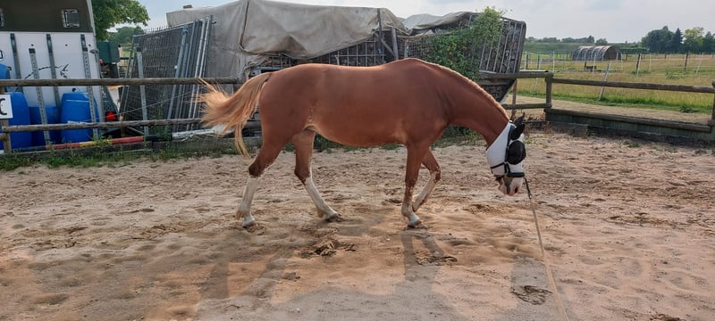 I am looking for an experienced new home for my 5-year-old Haflinger-German Riding Pony cross mare (1.57 m). She is backed but has not been ridden extensively yet, so she is suitable only for experienced riders. Unfortunately, I lack the time to further train her. She is a rather dominant, extroverted, yet sensitive mare with a lot of energy. She loves to work and is always motivated. She requires clear, confident leadership, but fun should not be missing. She walks safely on the longe in all three basic gaits, and under saddle, she also moves well in walk and trot. She still needs to develop her balance in canter. She enjoys ground work and variety in training. She is barefoot without issues, loads easily, and enjoys ground work and lunging. She is familiar with open stalls, 24/7 turnout, and paddock at night. Unfortunately, she has sweet itch, but this is currently well-managed with a blanket and regular cream application. Probable riding test possible on the riding arena for serious interest. Place before price. Transport within a 100 km radius can be arranged upon request.