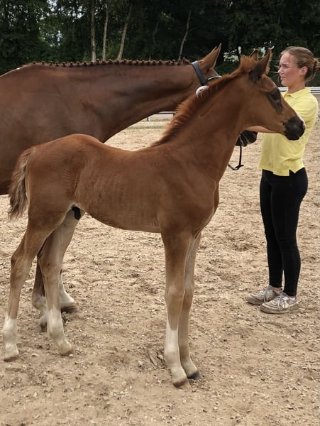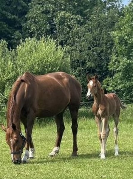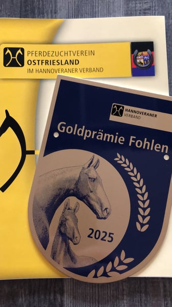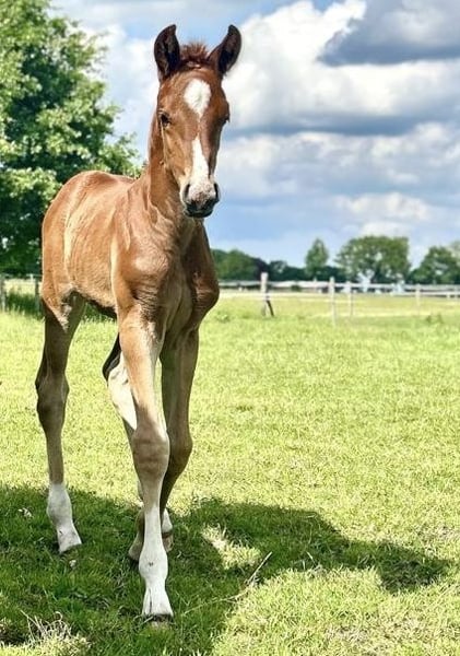 **Sales Advertisement: Hanoverian Stallion** For sale is a promising Hanoverian colt by the Celler Landstallion Barbarossa, born in May 2025. With an elegant dark chestnut coat and an estimated final height of about 170 cm, he is a true eye-catcher. This colt has been awarded the coveted "Gold Premium" by the Hanoverian Association, not least due to his outstanding movement potential. The dam is a full sister to the internationally highly successful Hanoverian "Duenensee" by Dancier, who is under Kevin Koemann (USA). If you are interested or require further information, please feel free to contact us. Viewings are possible by appointment.