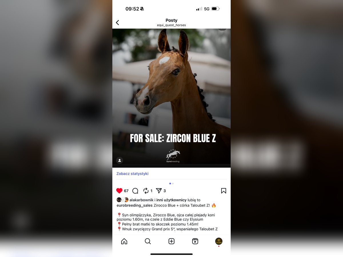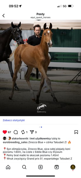 Śliczny ogierek Hannowerski po Zirocco Blue VDL . Matka to pełna siostra konia Titan 12 startującego pod polską zawodniczką do 145 cm . Matka zakupiona źrebna z renomowanej stadniny VDL w Holandii . Wychowany w grupie , przyzwyczajony do wszelkich zabiegów kosmetycznych i kowala . Przyzwyczajony do transportu i golenia . Szczepiony . Zapraszam do kontaktu w celu uzyskania dodatkowych informacji i umówienia się na oględziny. Beautiful Hannover colt by Zirocco Blue VDL. The mother is a full sister to the horse Titan 12, which competes under a Polish competitor up to 145 cm. The mother purchased the foal from the renowned VDL stud in the Netherlands. Raised in a group, accustomed to all cosmetic and blacksmith treatments. Used to transport and shaving. Vaccinated. Please contact me for additional information and to arrange an inspection.