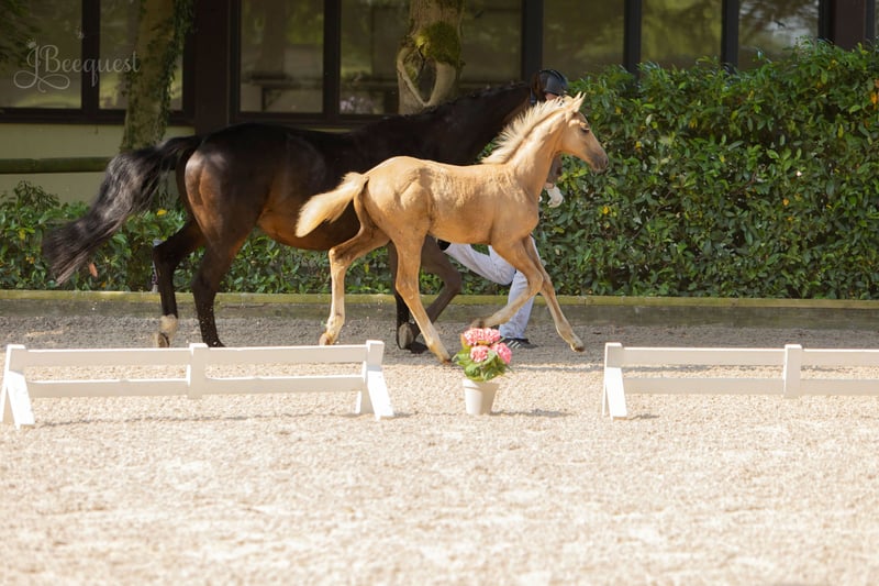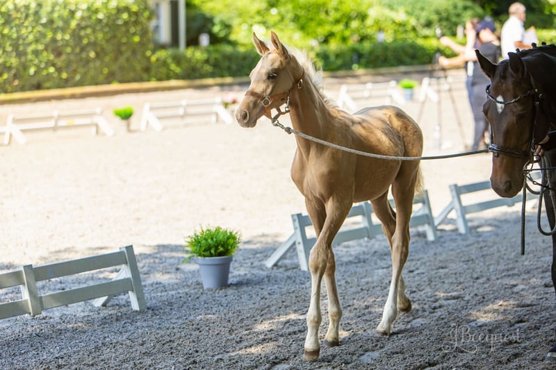 Quinario B Qandide x Bonifatius x Londonderry Wij bieden onze jaarling hengstveulingen Quinario te koop aan. Hij is geboren op 25 maart 2025. Door zijn vader is hij een zeer knap, licht palomino met een lange benen, een krachtige galop, uitstekende draf en sterke stap. Op de veulenschau werd hij uitgeroepen tot reservekampioen. Quinario is zeer zelfstandig en absoluut onbevreesd. Bierbikes op straat, lage heteluchtballonnen, vuurwerk en muziekkorpsen maken hem niet uit. Vanaf de eerste week oefenen we met de veulens het veulenkamp, zodat alle onze veulens bij de verkoop halstert, gewend zijn aan de trailer, de smid en de dierenarts. Ze maken kennis met alle dagelijkse geluiden op de boerderij en kennen honden. Onze merries met veulens grazen in de zomer samen op 2,5 hectare weiland, dag en nacht. In de herfst en winter zijn ze 10-12 uur overdag buiten, met 24/7 hooi, ’s nachts in grote geboorteboxen. Zo groeien de veulens mooi op en wennen ze meteen aan alle weersomstandigheden en temperaturen. Hij is het vijfde veulen van zijn moeder. Beautiful Mind 8 is een zeer elegante, mooie Staatsprämienkandidate uit de merriestam van Juggema. Ze is donkerbruin en ongeveer 1,68 m hoog. Haar eerste veulen, een voshengst van Goldberg, werd direct na de geboorte verkocht. Haar tweede veulen, een voshengst van Despacito, ging via de Elite Hannoveraanse Veiling naar Spanje. Haar derde veulen, uit Franziskus, werd gekroond en bevindt zich momenteel in de opleiding van haar ruiter. Dit is via Instagram te volgen. Haar vierde veulen, Felisa, is bij ons en kan zeker worden bekeken. Beauty is ontzettend knuffelig en goedmoedig en geeft dit slimme, fantastische type altijd door aan haar veulens. Beauty is, zoals al onze merries, getest en WFFS-negatief. Merriestam: Grafitti v. Graf Top (DRE: S** - succesvol met Elisabeth Beneke-Backhaus); Saphir v. Sunlight xx (VS: internationaal CIC*** - succesvol met Gerd-Olaf Neuberg); Dorian Gray v. Don Picardi (VA 2009: €47.000, DRE: S* - succesvol met Katrin Alkenings); gekeurde hengst Desperados FRH v. De Niro (VA 2003: €104.000, individueel brons en teamgoud op de Olympische Spelen Dressuur 2016 met Kristina Bröring-Sprehe); Don Diego v. Don Frederico (VA 2007, DRE: internationaal GP - succesvol met Juan Pablo Matute Guimon); gekeurde hengst Don Noblesse v. Dancier (DRE: internationaal GP - succesvol met Susan Pape); Weneziano v. Wolkenstein II (DRE: internationaal GP - succesvol met Martina Steisslinger); Akrobat v. Acord II (SPR: internationaal 1,40 m - succesvol met Philipp Ulrich). De vader, Qandide, is een mooie cremello hengst die zijn rustige en ontspannen aard doorgeeft aan zijn veulens. We hebben al een veulen van hem uit een andere merrie en kunnen duidelijke overeenkomsten zien. Ze lijken erg op elkaar in hun kalme en ongestoorde aard. Qandide is ECVM- en WFFS-negatief. Meer informatie over hem is te vinden op https://www.hengste-rohmann.de/qandide. Wij hechten veel waarde aan goede verzorging en transparantie, daarom kunnen geïnteresseerden een dagelijkse blik in onze fokkerij krijgen via Instagram. Q kan natuurlijk ook bij ons worden bezocht en bekeken. Een actueel bewegingsfilmpje kan worden gemaakt en op aanvraag worden toegestuurd. Op de laatste foto's zijn de moeder en de eerdere nakomelingen te zien. Hij staat nog bij ons, maar zal binnenkort verhuizen naar een eersteklas fokkerij. De plek kan indien gewenst worden overgenomen. Bij interesse of vragen kunt u contact met ons opnemen via bericht, WhatsApp of telefoon. Telefoon: +49 152 53765924