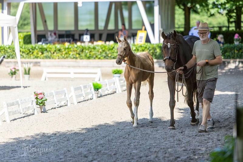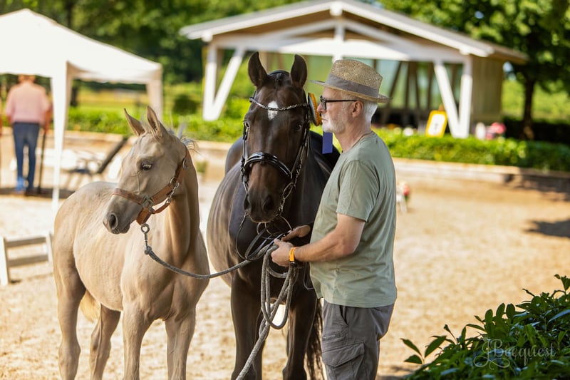 Quinario B Qandide x Bonifatius x Londonderry We are offering our colt Quinario born this year for sale. He was born on March 25, 2025. Due to his sire, he is a very handsome light Palomino. He has very long legs, a lively canter, an outstanding trot, and a strong walk. At the foal show, he was awarded Reserve Champion for these qualities. Quinario is very independent and completely fearless. Traffic noise, hot air balloons flying low, fireworks, and music bands do not bother him. From his first week, we start training the foal’s basics, so all our foals are halter-trained, load easily, and are familiar with the blacksmith and veterinarian at the time of sale. They learn to recognize all daily sounds on the farm and are accustomed to dogs. Our mares with foals graze together on 2.5 hectares of pasture during summer, day and night. In autumn and winter, they are outside for 10-12 hours during the day with 24/7 hay and housed in large foaling stalls at night. This ensures the foals grow up very well and get used to all weather conditions and temperatures right from the start. He is the fifth foal of his dam. Beautiful Mind 8 is a very elegant, beautiful state premium candidate from the Juggema dam line. She is dark bay and approximately 168 cm tall. Her first foal, a black stallion by Goldberg, was sold immediately after birth. Her second foal, a black stallion by Despacito, was sold at the Hannoveraner Elite Auction to Spain. Her third foal, by Franziskus, was awarded and is currently in training with his rider. You can follow him on Instagram. Her fourth foal, Felisa, is with us and can be visited. Beauty is incredibly affectionate and gentle, consistently passing on this intelligent and lovely temperament to her foals. Like all our mares, Beauty has been tested and is WFFS negative. Dam line: Grafitti v. Graf Top (DRE: S** success with Elisabeth Beneke-Backhaus); Saphir v. Sunlight xx (VS: international CIC*** success with Gerd-Olaf Neuberg); Dorian Gray v. Don Picardi (VA 2009: €47,000, DRE: S* success with Katrin Alkenings); Licensed stallion Desperados FRH v. De Niro (VA 2003: €104,000, individual bronze and team gold at the 2016 Olympic Dressage, ridden by Kristina Bröring-Sprehe); Don Diego v. Don Frederico (VA 2007, DRE: international GP success, bronze medal at the U25 European Championships 2016 with Juan Pablo Matute Guimon); Licensed stallion Don Noblesse v. Dancier (DRE: international GP success with Susan Pape); Weneziano v. Wolkenstein II (DRE: international GP success with Martina Steisslinger); Acrobat v. Acord II (SPR: success at 1.40 m show jumping with Philipp Ulrich). The sire, Qandide, is a handsome Cremello stallion who passes his calm, composed nature to his foals. We previously had a foal from him out of a different mare and can clearly see the similarities. Both are very similar in their relaxed, unshakable demeanor. Qandide is free from ECVM and WFFS. More information about him can be found at https://www.hengste-rohmann.de/qandide We prioritize good upbringing and transparency, so you can follow our breeding progress daily on Instagram. Of course, Qandide can also be visited and viewed at our farm. A current video of him in motion can be made and sent upon request. The last photos show his dam and previous offspring. He is still with us but will soon move to a top-class upbringing facility. The stall space can be taken over if desired. If interested or if you have any questions, please contact us via message, WhatsApp, or phone. Phone: +49 152 53765924