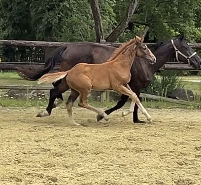 Der kleine Sohn von Bon Esprit aus einer Secret x Bretano II Mutter, möchte in die Fußstapfen seiner Vorfahren. Jetzt schon mit Schwung und Elan ausgestattet, wird er sicherlich mal durch das große Viereck tanzen. Ein Dunkelfuchs mit 4x weiß und korrektem Fundament zieht die Blicke auf sich. Ggf. steht auch die Stute zum Verkauf.