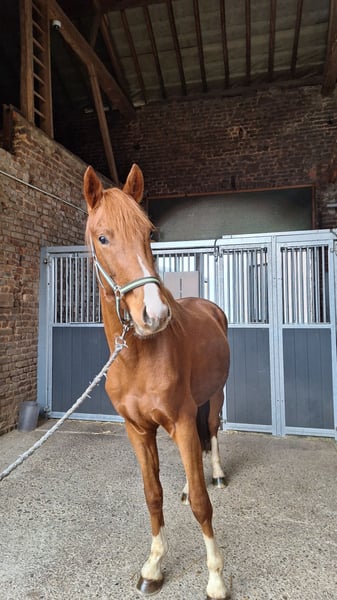 Dieser auffällig hübsche, selbstgezogene Junghengst, geboren 2023, von San to Alati aus einer Stute von Governor (Totilas) x United sucht ein neues Zuhause. Er bewegt sich sehr gut und schwungvoll, ist brav, umgänglich und nervenstark. Sein derzeitiges Stockmaß beträgt etwa 1,62m. Er wuchs in einer kleinen Herde mit einem weiteren gleichaltrigen Hengst und zwei jungen Wallachen auf. H Hufe auskratzen, putzen und führen sind für ihn selbstverständlich. In der Halle läuft er schon recht sicher auf Kommando in den einzelnen Grundgangarten. Wir geben ihn ab, da wir denken, dass er für den großen Sport hinten zu weich gefesselt ist. Daher braucht er eine schonende Ausbildung und einen neuen Möhrchengeber, der eher freizeitmäßig oder im unteren Dressurlevel unterwegs sein möchte und ein wenig mehr Zeit für die Ausbildung dieses charmanten Junghengstes investieren möchte. Sein Preis liegt bei 5000,- €, keine Händler!
