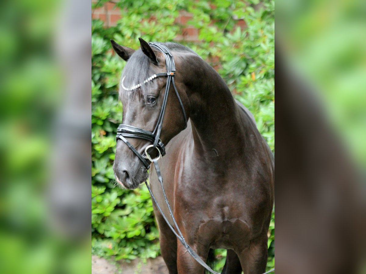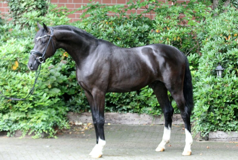 This sympathetic black horse immediately impresses with its four white socks. Its movement is also exceptional and leaves nothing to be desired. With an excellent attitude, there is nothing standing in the way of a promising career under saddle. That these qualities are not coincidental is revealed by a look at its pedigree. Sire Secret is already considered an exceptional horse with an unprecedented breeding record. At the World Championship for Young Dressage Horses in Ermelo 2024, Secret has 15 participants, 10 of which are in the ranking of the six-year-olds. This includes the vice-champion of the four-year-olds, the bronze medalist of the five-year-olds, and the vice-world champion of the six-year-old dressage horses. At the concurrently held Bundeschampionat, another 25 offspring of Secret competed, including numerous finalists and the vice-bundeschampion of the four-year-old mares and geldings. According to FN, the number of licensed and recognized sons has risen to 55, including many premium stallions and celebrated prize winners. Grandfather Bon Coeur impresses both with his own sporting career and that of his offspring. He was a premium stallion at his licensing, winner of his 30-day test, and a two-time vice-bundeschampion. His titles also include the Weltmeyer Prize 2018 and the Grande Prix 2023. X-rays are available. Video upon request.