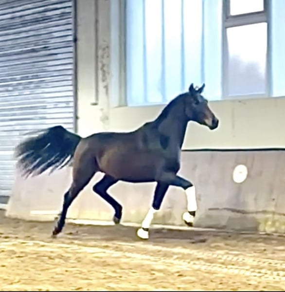 „Everybodys Darling“ porta pienamente il suo nome: con il suo carattere socievole e il suo espressione nobile, cattura immediatamente l’attenzione di chiunque. Nei movimenti già mostra un potenziale superiore alla media, promettendo una carriera come cavallo da dressage molto promettente. È cresciuto in branco, quindi è molto sociale e affabile. Conosce il traino, il ferratura, ecc., ed è ora pronto ad affrontare tutte le altre sfide. Per qualsiasi altra domanda, sono a vostra disposizione.