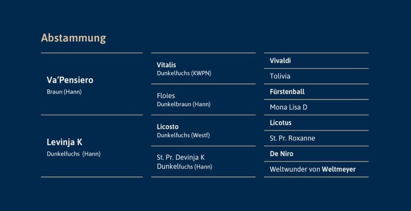 von Va’Pensiero – Licosto zugelassen für Hannover, Oldenburg, weitere auf Anfrage WFFS-frei Röntgenprotokoll unter www.hof-thelker.de Züchter: Horst-Herbert Karrasch Decktaxe Frischsamen: 300 € bei Besamung + 500 € bei Trächtigkeit (zzgl. USt.) Jungzüchterrabatt! Züchtern bis 30 Jahre gewähren wir 30% Rabatt! Weitere Informationen bei Christian Thelker +49 175-854 3529 oder Karl-Heinz Hooghoff +49 170 4450576 Vodka Lemon besticht auf den ersten Blick! Sein herrlich konstruiertes Exterieur, mit großzügigen Partien ausgestattet und dem gewissen Etwas in der Ausstrahlung machen ihn zu einem echten Eyecatcher. Er überzeugt in allen drei Grundgangarten mit enormer Leichtfüßigkeit und zeigt sich unter dem Reiter bereits ausgesprochen rittig. In seinem Veranlagungstest bestach Vodka Lemon mit seiner Leichtfüßigkeit im Trab und Galopp. Va‘Pensiero – der Vater Sein Vater, Va’Pensiero, war nicht nur Hannoveraner Champion, sondern konnte auch seine HLP sowie das Bundeschampionat der 3-jährigen Hengste mit Höchstnoten für sich entscheiden. Über Vitalis und Fürstenball kombiniert er die wohl begehrtesten Rittigkeitsvererber der Gegenwart und bietet besonders hochwertige Dressurgenetik. Levinja K – die Mutter Hannoveraner Prämienstute Levinja K war Klassensiegerin auf dem Dobrock und brachte neben Vodka Lemon auch den prämierten und bis zur Klasse S erfolgreichen Bitcoin (v. Bon Coeur), sowie Lord Licosto (v. Lord Europe) der ebenfalls über den Hannoveraner Hengstmarkt in fördernde Hände verkauft werden konnte. Sie ist zudem Halbschwester zum Prämienhengst Luca (v. Londontime). Der Stutenstamm der Schließerin gehört zu den erfolgreichsten Hannoveraner Stutenlinien und brachte unter anderem auch Flim Flam mit Susan Blinks Team-Bronze bei den Olympischen Spielen in Sydney 2000 sowie Team-Silber bei der WM in Jerez de la Frontera 2002, World Magic unter Ulla Salzgeber, White Foot unter Michael Klimke sowie Dark Dynamic unter Sarah Runge.
