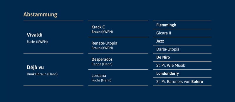 von Vivaldi – Desperados gekört für Hannover und Oldenburg, weitere auf Anfrage WFFS frei Röntgenprotokoll unter www.hof-thelker.de Züchter: Christian Thelker Decktaxe Frischsamen: 300 € bei Besamung + 500 € bei Trächtigkeit (zzgl. USt.) Jungzüchterrabatt! Züchtern bis 30 Jahre gewähren wir 30% Rabatt! Weitere Informationen bei Christian Thelker +49 175-854 3529 oder Karl-Heinz Hooghoff +49 170 4450576 Veltins hat das Besondere. Nicht nur genetisch bringt er alles mit, was wir uns wünschen, auch unter dem Sattel begeistert er mit seiner Mechanik und den hervorragenden Reiteigenschaften. Vivaldi – der Vater Vivaldi war in den Niederlanden HLP-Reservesieger und gewann 2007 den Pavo Cup der Fünfjährigen (vergleichbar mit dem Bundeschampionat). Von Hans Peter Minderhoud/NED wurde er 2008 und 2009 zum Sieg in der KNHS/KWPN Hengst-Serie geritten, wobei er für seinen Trab die 10 erhielt. Anschließend platzierte er sich international erfolgreich bis St. Georges. 2013 gewann er bei der KWPN-Körung die VHO-Trophy. Er gehört seit Jahren zu den Top Dressurpferdevererbern der Welt und ist nicht nur durch den Louisdor Preis Sieger Viva Gold auch in diesem Jahr wieder aktueller denn je! Déjà vu – die Mutter Die Zuchtleistung seiner Mutter „Déjà vu“ ist ebenfalls beachtlich, ihr erstes Fohlen Estero von Escolar nahm dreimal am Bundeschampionat teil und konnte sich 2019 an 4. Stelle im Finale der fünfjährigen Dressurpferde platzieren und ist inzwischen unter Shelly Francis Grand-Prix siegreich. Seine ein Jahr jüngere Vollschwester Et voila platzierte sich 2018 beim Bundeschampionat der dreijährigen Stuten und Wallache an 7. Stelle und ist mittlerweile in der schweren Klasse erfolgreich. Déjà vus drittes Fohlen Ballance von Ballantines Finest qualifizierte sich für das deutsche Fohlenchampionat in Lienen. Dreijährig legte sie eine hervorragende SLP ab (Fremdreiter 10,0) und wurde mit der Hannoveraner Prämie ausgezeichnet. Déjà vus viertes Fohlen ist unser Stationsbegründer Beck´s FRH! 2025 wurde Déjà vu mit ihre Tochter Ballance und ihrer Enkeltochter als Elite-Familie ausgezeichnet und konnte auf der Herwart-von-der-Decken Schau in Verden das internationale Fachpublikum mit ihrer Bewegungsmechanik begeistern! Mit Veltins schickt sie einen weiteren vielversprechenden Nachwuchsvererber ins Rennen. 2 gekörte Hengste, 1 Hannoveraner Prämienstute, insgesamt 5 Teilnahmen am Bundeschampionat, 3 S-erfolgreiche Dressurpferde, 1 Grand-Prix Pferd, 1 Bronzemedaille bei der WM.