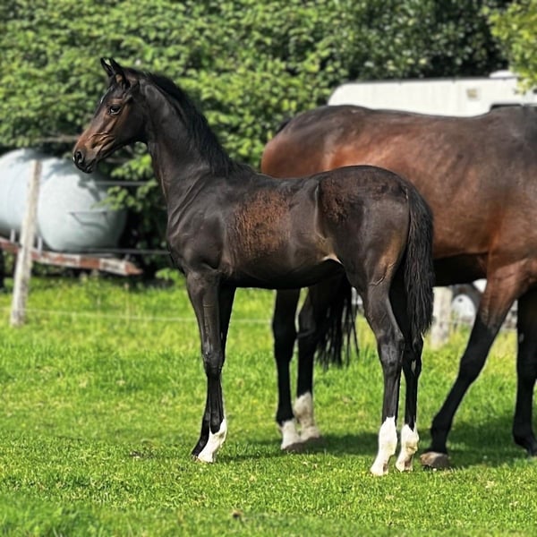 This colt has three outstanding and relaxed basic gaits with a lot of elasticity, balance, and rhythm. Due to his high basic quality, this young stallion is ideally suited for demanding dressage sports and is of interest to both ambitious amateurs and professionals. Correct conformation, a lot of natural charisma, and a friendly, alert character! Estimated final height is approximately 168-169 cm. An exciting, top-bred young horse for anyone looking to invest in quality early on. Completely healthy, regularly shod, regularly dewormed, microchipped, and well cared for. From a renowned, experienced breeder and in excellent condition. Upon request, the stallion can be gelded or remain for further development – there is definitely potential as a stallion candidate. Further information available upon request! We can arrange a viewing immediately. Feel free to contact us via WhatsApp: +49 176 55323449. The sire of this high-quality colt is the exceptional stallion DSP De Sandro (Dressage Stallions Schleier): He was the South German Champion of 3-, 4-, 5-, and 6-year-old dressage horses – the first South German four-time champion ever! For his above-average athletic performance, he received the DSP name addition. Furthermore, he achieved an excellent stallion performance test with a dressage score of 8.56 (3rd place out of 31), was a spectacular premium stallion at his licensing, and placed in the Bundeschampionat final. After successes up to class S, DSP De Sandro is now fully focused on breeding. His offspring include a licensed champion stallion and numerous championship foals. The first offspring are already showing athletic successes appropriate for their age. With a breeding value of 137 (young horse tests) according to FN, he is among the top sires of his generation. It is expected that this foal will inherit the exemplary attitude and excellent riding qualities of his father.