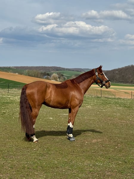 Due to family reasons, we are reluctantly offering our homebred chestnut gelding, "Flo," for sale. 16.1 hh, Floriscount x Fürst Grandios, born in 2016 The gelding has been bred by us and has never been out of our hands. Initially, he was introduced to young riders at competitions, but due to family planning, he was no longer actively promoted in sport. In recent years, he has been a reliable and beloved family horse at home, bringing joy every day. He is truly a family member. Flo is very well-behaved and reliable in daily handling, especially gentle and patient with children. He is uncomplicated when grooming, leading, and tacking up. Even when ridden by children, he remains calm and cautious. Over the past years, he has been consistently trained in dressage and also enjoys jumping, comfortably working over cavaletti exercises without issues. In the field, he is confident both alone and in a group, walking, trotting, and cantering without problems. This horse is an ideal family, leisure, or all-round partner. However, he is not suitable as a beginner’s horse. He has never been ill in all the years he has been with us. The horse will only be placed in the best hands. A loving home is our top priority! Flo is being offered including saddle and accessories. Please contact us at +49 160 1864423 if interested.