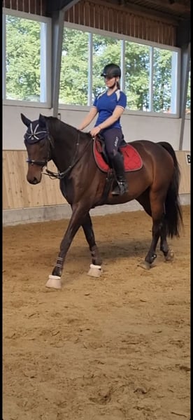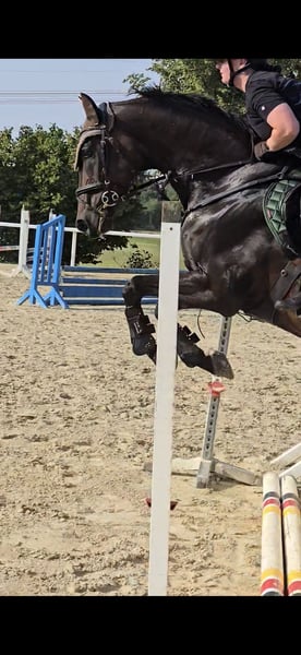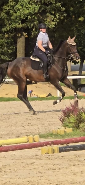 Dear gelding, due to a lack of time and my own horse breeding, is being offered to the best hands. He is familiar with trail rides, riding vacations, and drag hunting. In the field, he is cool but attentive, not flighty. Easy to handle. We have now started jumping with him. He does it great. He nicely tucks his legs away and has a fantastic pace for courses. No refusals, not spooky. I envision him with an ambitious rider who enjoys trail rides just as much as course training. A great leisure partner with potential in show jumping. Very well-mannered, gentle, but still needs loving, consistent guidance. No inquiries from complete beginners, riding schools, or vaulting. The horse has been in our possession for 5 years. Never sick, lame, or anything like that.
