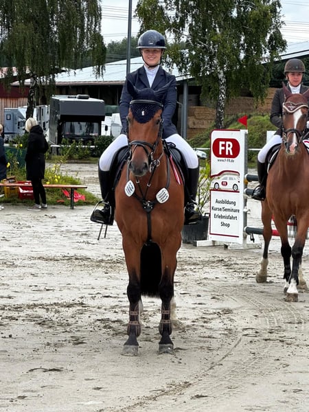 Schweren Herzens geben wir unseren 13-jährigen Wallach ab, der sich seit seinem fünften Lebensjahr in unserem Besitz befindet. Er wurde größtenteils von einer jungen Amateurreiterin ausgebildet und auf Turnieren bis M*-Springen vorgestellt, wobei er Platzierungen bis zur Klasse L erreichen konnte. Sein Herz schlägt für den Springsport. Er geht mit viel Motivation in den Parcours und ist stets fair zum Reiter, was ihn zu einem guten Lehrpferd macht. In der Dressur zeigt er drei solide Grundgangarten und beherrscht Lektionen bis zur Klasse M. Er wurde gelegentlich in A- und L-Dressuren vorgestellt und konnte auch hier die ein oder andere Platzierung in der Klasse A erreichen. In der täglichen Arbeit ist er sehr unkompliziert und macht viel Freude beim Reiten. Im letzten Jahr war er gemeinsam mit mir das erste Mal im Gelände unterwegs, wo er sich ebenfalls sehr brav und mutig in der Gruppe zeigte. Der ein oder andere Baumstamm stellte dabei kein Problem für ihn dar. Allgemein ist er ein sehr braves und erfahrenes Pferd, das mit viel Herz und Freude bei der Arbeit ist. Er freut sich über seine Freunde auf dem Paddock oder der Wiese, ist verspielt und wird auch gerne gekrault. Auf dem Turnier ist er ebenfalls super unkompliziert im Umgang und hat keine Probleme mit vollen Abreiteplätzen oder einem Traktor, der neben ihm den Boden abzieht. Wir geben ihn ab, da ich es neben dem Studium zeitlich leider nicht mehr schaffe, den Reitsport weiterzuführen. Wir hoffen, dass er ein tolles Zuhause findet, in dem er geliebt wird und sein schönes Leben weiter genießen kann. Er war in all den Jahren bei uns immer gesund und zeigt keinerlei Unarten. Für Videos und weitere Fragen können Sie sich gerne melden.