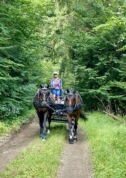 Zum Verkauf steht ein schicker 14-jähriger Winterrappe von Quite Rubin x Piano II mit einem Stockmaß von ca. 175 cm. Quaid ist auf einem guten A-Niveau in der Dressur sowie Springen ausgebildet und 2-spännig gefahren. Er kennt die regelmäßige Arbeit an der Longe sowie Doppellonge. Er geht alleine sowie in der Gruppe ins Gelände. Als Handpferd läuft er gerne und sehr brav in allen drei GGA mit. Im Umgang zeigt sich Quaid unkompliziert, er möchte einem immer gefallen und alles richtig machen. Quaid ist ein verschmuster und menschenbezogener Wallach. Gibt man ihm Sicherheit, dankt er es mit Zuverlässigkeit und einem ehrlichen Charakter. Aufgrund seiner Größe und seiner Sensibilität ist er nicht für Anfänger oder unsichere Reiter geeignet. Natürlich kennt er das „Bauernhofleben“ mit Traktoren, Kinder, Hunde, Straßenverkehr, etc. Aktuell ist er beschlagen, da unsere Böden ein Barhuf laufen nicht möglich machen. Eine Umstellung auf Barhuf wäre aber laut meinem Hufschmied problemlos möglich da er sehr gute Hufe hat. Quaid ist somit natürlich Schmiede- als auch Verladefromm. Quaid steht bei uns im Sommer 24/7 auf der Weide und im Winter im Offenstall in einer Wallachherde und ist eher rangniedrig. Diese Haltungsform würde ich mir für ihn auch weiterhin wünschen da er hier sehr ausgeglichen ist und den Sozialkontakt liebt. Alternativ wäre noch Paddockbox mit täglichem Weidegang möglich. Er wird aber nicht in reine Boxenhaltung abgegeben. Vorerkrankungen sind keine bekannt. Quaid ist natürlich regelmäßig geimpft und entwurmt, Zähne wurden im Frühjahr zuletzt kontrolliert. Ich wünsche mir für Quaid eine/n ambitionierte/n Freizeitreiter/in der/die keine regelmäßigen Turnierambitionen hat sondern mehr Wert auf einen tollen Freizeitpartner legt. Es handelt sich hier um keinen Notverkauf, wegen Bestandsverkleinerung abzugeben. Platz vor Preis! Bei Interesse können gerne Videos versendet werden.
