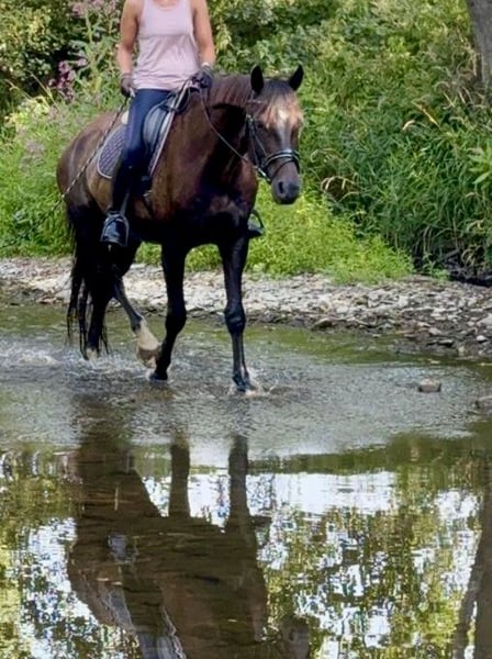 Na sprzedaż jest elegancki 14-letni zimowy ogier w kolorze czarnym od Quite Rubin x Piano II o wzroście około 175 cm. Quaid jest wyszkolony na dobrym poziomie A w ujeżdżeniu oraz skokach i jest zaprzęgany w parze. Zna regularną pracę na lonży oraz podwójnej lonży. Samodzielnie oraz w grupie wychodzi w teren. Jako koń towarzyszący chętnie i bardzo grzecznie uczestniczy we wszystkich trzech chodach. W obcowaniu Quaid jest bezproblemowy, zawsze chce zadowolić i robić wszystko dobrze. Quaid jest przytulnym i towarzyskim wałachem. Jeśli zapewnisz mu bezpieczeństwo, odwdzięczy się niezawodnością i szczerym charakterem. Ze względu na swój wzrost i wrażliwość nie nadaje się dla początkujących ani niepewnych jeźdźców. Oczywiście zna życie na „farmie” z traktorami, dziećmi, psami, ruchem drogowym itd. Obecnie jest podkowany, ponieważ nasze podłoża nie pozwalają na chodzenie bez podków. Jednak według mojego kowala zmiana na chodzenie bez podków byłaby bezproblemowa, ponieważ ma bardzo dobre kopyta. Quaid jest więc naturalnie spokojny zarówno w stosunku do kowala, jak i przy załadunku. Latem Quaid przebywa u nas 24/7 na pastwisku, a zimą w stajni otwartej w stadzie wałachów i jest raczej w niższej hierarchii. Taki sposób utrzymania chciałbym kontynuować, ponieważ jest tutaj bardzo zrównoważony i uwielbia kontakt społeczny. Alternatywnie możliwa jest także boksy paddockowe z codziennym dostępem do pastwiska. Nie będzie jednak wydawany w czystej hodowli boksowej. Nie są znane żadne wcześniejsze choroby. Quaid jest regularnie szczepiony i odrobaczany, a zęby były ostatnio kontrolowane wiosną. Szukam dla Quaida ambitnego jeźdźca rekreacyjnego, który nie ma regularnych ambicji turniejowych, ale bardziej ceni sobie wspaniałego partnera do rekreacji. Nie jest to sprzedaż w trybie pilnym, sprzedajemy z powodu zmniejszenia stanu posiadania. Miejsce przed ceną! W razie zainteresowania chętnie prześlę filmy.