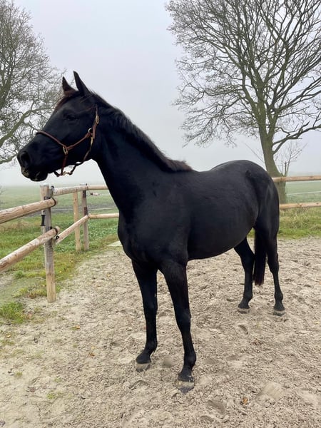 Dieser sehr schöne 3 jährige Rappe ist aktuell noch roh und wird wegen Bestandsverkleinerung und auf Grund der aktuellen Marktlage günstig abgegeben.. Er stammt ab von Quality Control aus einer Earl Mutter und ist ca. 1.63m groß. Er ist kein Lampenaustreter , aber verfügt über solide schöne Grundgangarten und steht korrekt auf stabilem Fundament. Er ist bei uns seit Fohlenalter an, wurde stets mit Mineral versorgt, regelmäßig entwurmt, dem Schmied vorgestellt und war noch nie krank. Er ist ein schöner kompakter Wallach , der im Amateur und Freizeitbereich sicher als Allrounder in allen Sparten zu Hause für weitere Informationen gerne anrufen 017662637296.