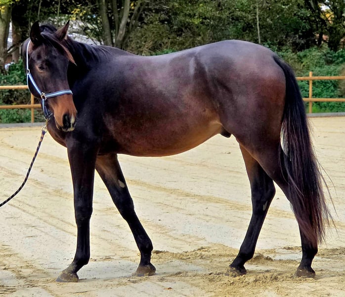 Dominello è nato presso di noi a febbraio 2023 ed è assolutamente mansueto nel suo approccio. Fa parte del nostro gruppo di cavalli e conosce l'aperto. Ha un certificato TÜV di aprile, con controllo schiena e collo senza rischi. È abituato al ferratura ed è tranquillo durante la pulizia, la toelettatura e le passeggiate. La sua madre è piazzata con un livello da amatore fino a S*. Attualmente misura circa 170 cm di altezza al garrese. Il prezzo richiesto è di 7.000 euro, trattabili.
