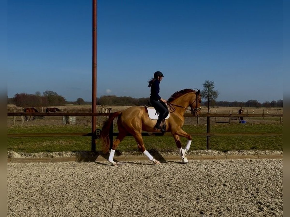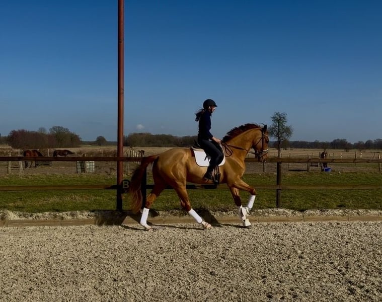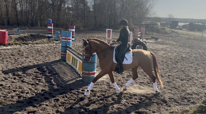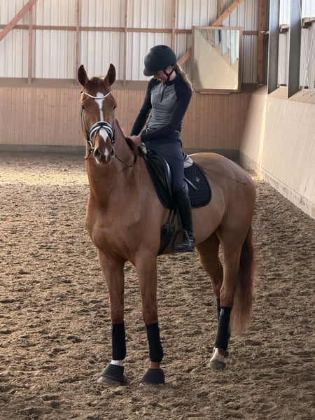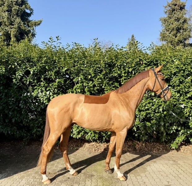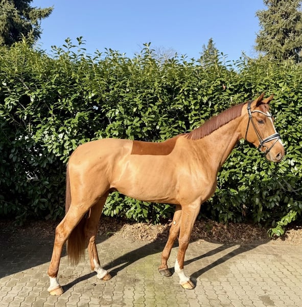 For sale: Young Hanoverian gelding, born in 2022, standing at 17.7 hh. This elegant chestnut impresses with his excellent rideability. The gelding is well-trained, reliable in handling, and exhibits a strong willingness to learn. With his typy appearance and potential for the dressage arena, he is ready for his first competition outings. He brings joy every day and is very balanced. Vincento has a slight respiratory noise and a microchip.