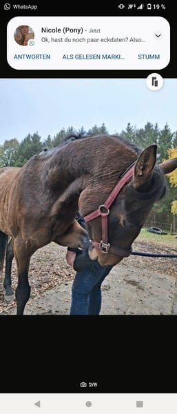Favori nació en abril de 2021. Originalmente quería entrenarlo como compañero de ocio, pero lamentablemente, debido a un accidente, actualmente no puedo montar. Además, resultó que Favori es un Hannoveraner puro. ¡Le gusta trabajar! En el campo, ya sea a pie o con bicicleta, no muestra mucho interés, pero en cuanto entra en la pista, apenas se le puede cansar. Por eso, lamentablemente, no es feliz conmigo. Favori fue criado desde los 6 meses, da las patas con paciencia y se deja cargar sin problemas. Conoce la atadura, disfruta del cepillado y está familiarizado con el box y el paddock, así como con tractores, perros y niños. Es muy sociable con las personas, siempre dispuesto a una broma. Responde a su nombre, relincha y viene a saludar. No se conocen enfermedades. El año pasado dio un salto considerable y ahora mide aproximadamente 1,67 m. Está completamente desarrollado y listo para aprender a convertirse en un auténtico caballo de doma. Un caballo de ensueño que busca a su humano. Probablemente más orientado a la disciplina de salto, ya que en su pedigree lleva a 'For Pleasure'.