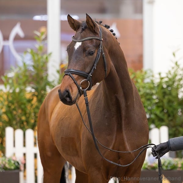 Fridolin der Grosse zeigt sich locker, schwungvoll und ausbalanciert. Ein Dressurtalent in herrlicher Aufmachung aus dem Züchterhaus Hans-Otto Pape aus Dedelsdorf. Die hohen Rittigkeitswerte dieses Dressuryoungsters kommen nicht von ungefähr. Mutter Henna weist Erfolge in Dressurprüfungen der Klasse L sowie in Dressurreiterprüfungen auf. Aus dem Mutterstamm stammt u. a. das Sportpferd Wiedehopf v. Wienerwald (DRE: M mit Natalie Wolf). 2. Generation Auktionspferde: Fiete v. Fusionist (FoVA 2022). 3. Generation Aufbauprüfungen Dressur: Rubins Romeo v. Riedinger (DRE: L). Bes. Prämientöchter: StPr Guernica v. Grand Cru. 4. Generation Bes. Prämientöchter: StPr Scarlett/Scarlett 187 v. Sherlock Holmes. Mutter: Henna ZL: 4/4 Turniererfolge: DRE: L 1/1. 4/3. 1/4. 1/5. 2/w. DRE: A 3/1. 2/2. 4/3. 4/4. 4/5. 8/w. DPF: A 1/2. 1/w. DRE: E 1/1. Großmutter: Guernica Prämierung: 2xIa. ZL: 14/10 ZSP: Feldprüfung Reitpferd - Trab 8,00 Galopp 7,00 Schritt 7,00 / Durchschnitt Rittigkeit 7,50 / Durchschnitt Springen 8,00 Das Pferd ist ein Verdener Auktionspferd und wird am 25.01.2026 online versteigert. Vom 12.01. bis zum 25.01. kann das Pferd jeden Tag beim öffentlichen Training besichtigt und ausprobiert werden. Das Startgebot bei der Versteigerung ist 8.000 Euro.