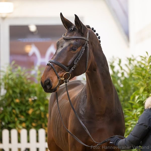 Festus ist ein imposanter Dressurschüler, der mit viel Gleichmaß und Harmonie im Bewegungsablauf beeindruckt. Mit auffälligem Bewegungshebel und außergewöhnlicher Versammlungsfähigkeit zeigt er sich als ideales Ausbildungspferd. Bereits siegreich in einer Reitpferdeprüfung besticht er durch Talent und Lernbereitschaft. Der wertvolle Stutenstamm wird zusätzlich durch den Top-Athleten Santos v. Stedinger (DRE: S*** mit Micah Deligdish) geprägt. Sportname: Festus 186 Turniererfolge: RPF: 1/1. 3. Generation Sportpferde Dressur: Santos/Santos 803 v. Stedinger (DRE: S*** mit Micah DELIGDISH,GP - Grand Prix 2024,GP - Grand Prix 2022,GP - Grand Prix 2022). Aufbauprüfungen Dressur: Hemingway 50 v. His Highness (DRE: L). Auktionspferde: Dario v. Dancier (VA 2013); Herzogin/Haley 6 v. His Highness (VA 2009). Bes. Prämientöchter: StPr Himmelsschlüssel v. His Highness. 4. Generation Sportpferde Springen: Cartoon 34 v. Cornado II (SPR: 1,40 m mit Marie Helmberger); v. Cornado II (SPR: 1,45 m mit Julien RENAULT); Cassis/Cassis 82 v. Chacco's Son II (SPR: 1,30 m mit Julia Baier); Petite Louise v. Los Angeles (SPR: 1,30 m mit Pia Baier); Fürst Hermann v. Fürst Piccolo (SPR: 1,30 m mit Marvin Ackermann); LS-S Pia noir v. Piano II (SPR: M mit Müller,Julia). Aufbauprüfungen Springen: VbPr Flora/Flora 365 v. Ferragamo (SPR: L). 5. Generation Sportpferde Dressur: Pirella 16 v. Perplex (DRE: S mit Fortnagel,Marion); Romero 30 v. Rosenduft (DRE: M mit Sulzberger,Jürgen). Mutter: Ballade ZL: 9/6 Großmutter: Weltflorida ZL: 3/2 Das Pferd ist ein Verdener Auktionspferd und wird am 25.01.2026 online versteigert. Vom 12.01. bis zum 25.01. kann das Pferd jeden Tag beim öffentlichen Training besichtigt und ausprobiert werden. Das Startgebot bei der Versteigerung ist 8.000 Euro.