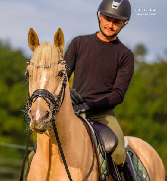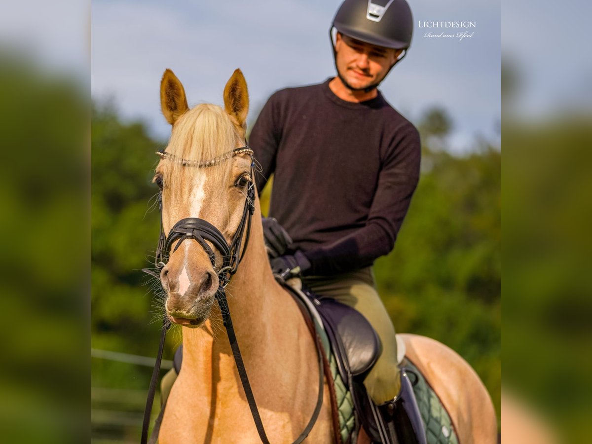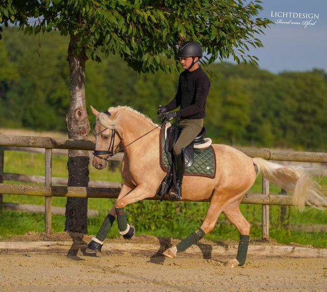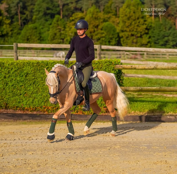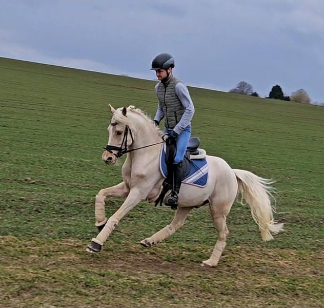 Golden Moon, also known as Keni, is a truly well-behaved, consistently reliable, and always motivated pony. He is exceptionally friendly both in handling and under saddle and always eager to please. He is characterized by three solid, absolutely rhythmical gaits. Farrier, loading, clipping, veterinarian visits, and washing are all no problem for him. He gets along very well with mares or geldings, whether in the pasture or on the paddock. He loves being around people, children, and dogs, and is always in good spirits. Only cold weather does not suit him ;-) He has a very good TüV, including neck and back. For inquiries, please feel free to call 0163 7883226 or send a WhatsApp message.