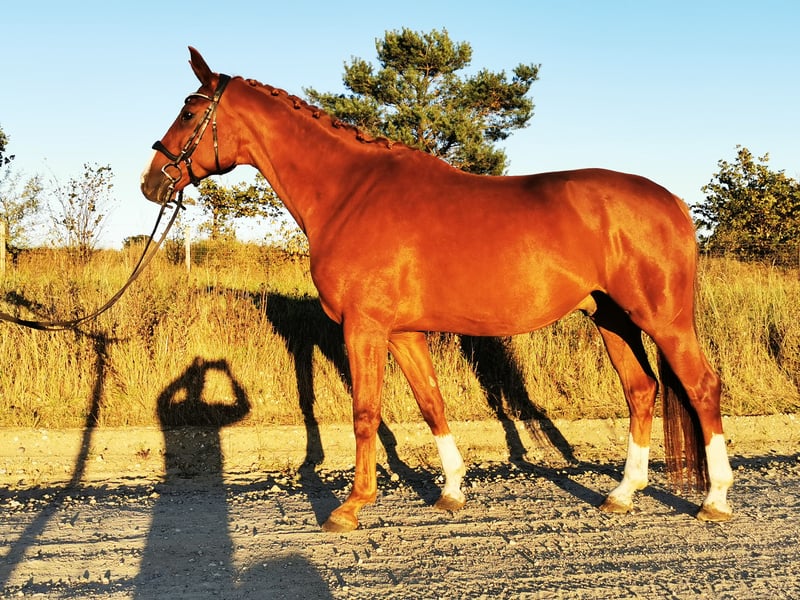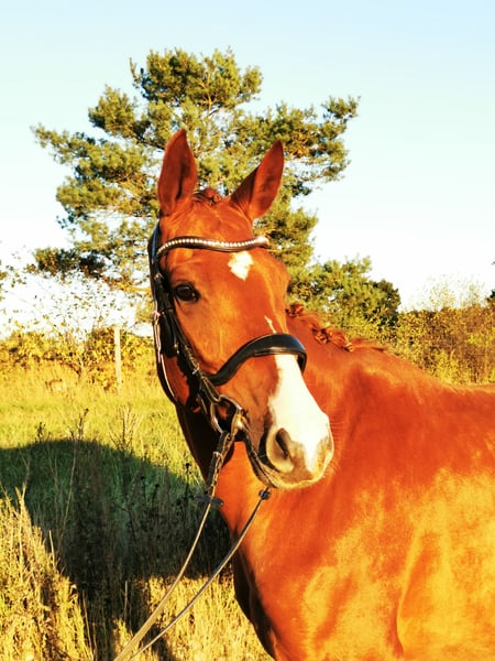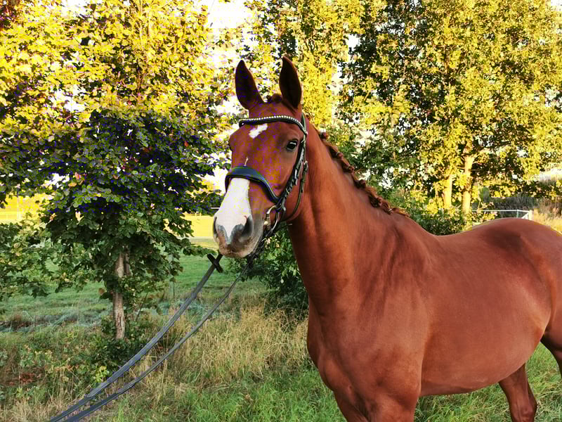 This 6-year-old Hanoverian is a beautiful colorful dark chestnut gelding with a height of approximately 1.67 m by Destano - Desperados x Don Frederico - Rubinstein I. He impresses not only with his finest dressage bloodlines but also with his great work ethic: the video with the white saddle pad was taken after a 3-week break. He is simply fun to ride! The second video was taken when he was 5 years old after 4 weeks of training; he was given time for physical development beforehand. With a lively, rhythmic movement and lightness in the hand, he was worked at a solid A-level last year and is now starting his very first L-level exercises. Due to his lineage, he finds balance and self-carriage easy. He has enough enthusiasm but is by no means too spirited in the arena and responds excellently to voice and breathing cues. As part of his initial training, he has jumped a small E-course. During the horse handler license training, he patiently practiced groundwork with children; he is also familiar with bridges and tarps. He works without side reins (also on the lunge) with children and less experienced riders in the arena and indoor riding hall - here, Olaf easily forgives mistakes. He adapts to the rider's level in the arena. He is familiar with trail rides alone and in groups under experienced riders at A-level, as he still needs security from above on unfamiliar routes due to his age. Olaf is very traffic-safe (including large agricultural machinery) and also goes through water. He is, of course, familiar with strange places and indoor arenas. He has not yet been presented at competitions. Absolutely gentle when being sprayed, washed, with the veterinarian, farrier, loading, and in daily handling. He is barefoot. He knows open stabling and paddock boxes. Olaf would certainly be very suitable for an ambitious leisure rider with a focus on dressage, as a family horse for experienced individuals, or for good riding schools.