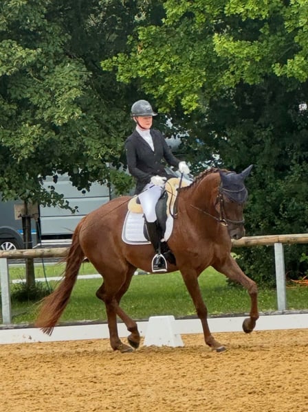 6 - jähriger Wallach mit Herz, Klasse und Perspektive. Duplo beeindruckt nicht nur durch seine Bewegung, auch sein Wesen berührt. Er vereint alles was man sich von einem modernen Dressurpferd wünscht: Eleganz, Qualität und Charakter. Seine Abstammung spricht für sich - Vater Dimaggio, ein Garant für Rittigkeit und Ausdruck, Mutter von Benetton Dream, bekannt für kraftvolle Bewegungen und feine Reiteigenschaften. Erst Ende 4-jährig angeritten, zeigt er sich jetzt auf A-Niveau, beherrscht aber auch schon L-Lektionen. Sein wahres Kapital ist sein Charakter: Mit seiner liebenswürdigen Art schafft er sofort Vertrauen. Menschenbezogen, ehrlich und stets bemüht alles richtig zu machen. Ein Pferd das gefallen möchte. Extrem brav, verladefromm und im täglichem Umgang ein echter Sonnenschein.