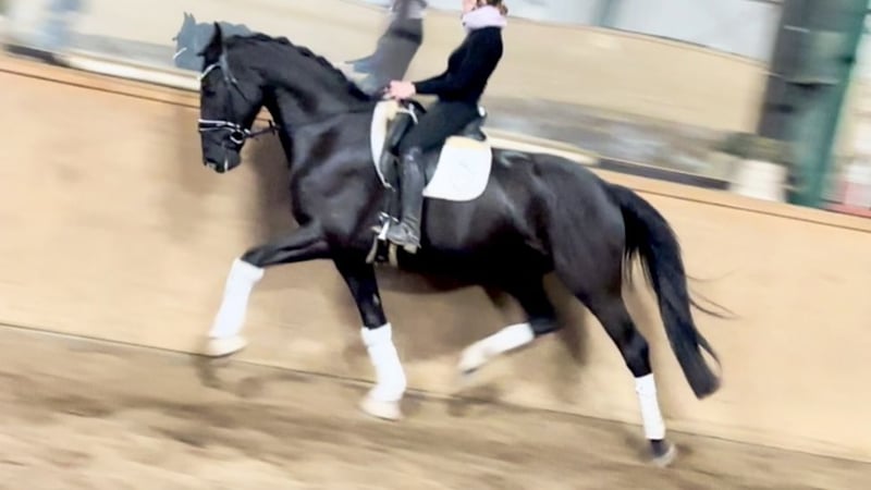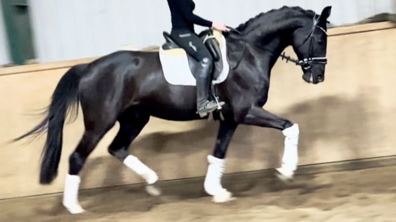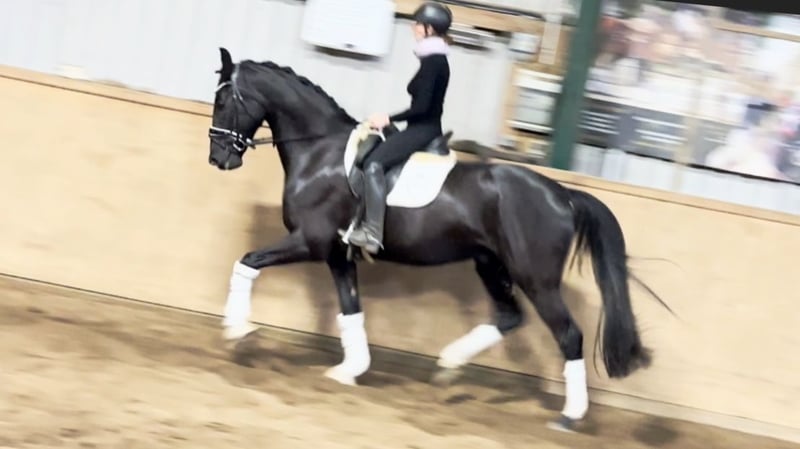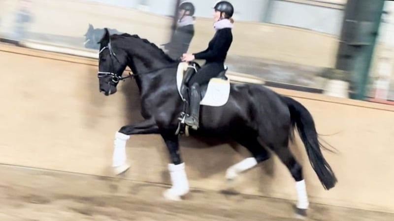 Impressively beautiful, jet-black, eager to learn, easy to ride, and an intelligent mover for the large arena – suitable for junior riders! For sale on behalf of the owner is this stunning 6-year-old Hannoveraner gelding standing 16.1 hh, with excellent dressage lineage from DOHNANYI x RASCALINO x WARKANT. "DON" already impresses visually. With his shiny black coat, two white markings on the hind legs, a typy face, an imposing presence, and a harmonious build, he immediately draws all eyes. In movement, "DON" proves to be a sporthorse for the grand arena. Equipped with plenty of impulsion and push, he moves with a very rhythmic, expansive gait. He also features a very good hind leg, with considerable power, ground contact, a wide base of support, and well-angled joints. This results in expressive ground cover, shoulder freedom, impulsion, engagement, and a tendency to uphill movement. "DON" is rideable and pleasant in contact. He seeks to please and readily accepts and executes rider aids, making him suitable for junior riders with some young horse experience. Overall, this is a promising young dressage horse with a solid foundation for the Grand Prix level, boasting an outstanding walk! "DON" was gently backed at the end of his 4th year and has been in professional training ever since. He is confidently progressing at Dressage Horse A level and has begun work at L level. His attitude and ambition make him a cooperative performance horse with the right mindset for sport. After purchase, "DON" can remain in our professional training program if desired. A comprehensive radiological examination (18 images + back) and a current clinical check are available, ensuring a smooth sporting career ahead.